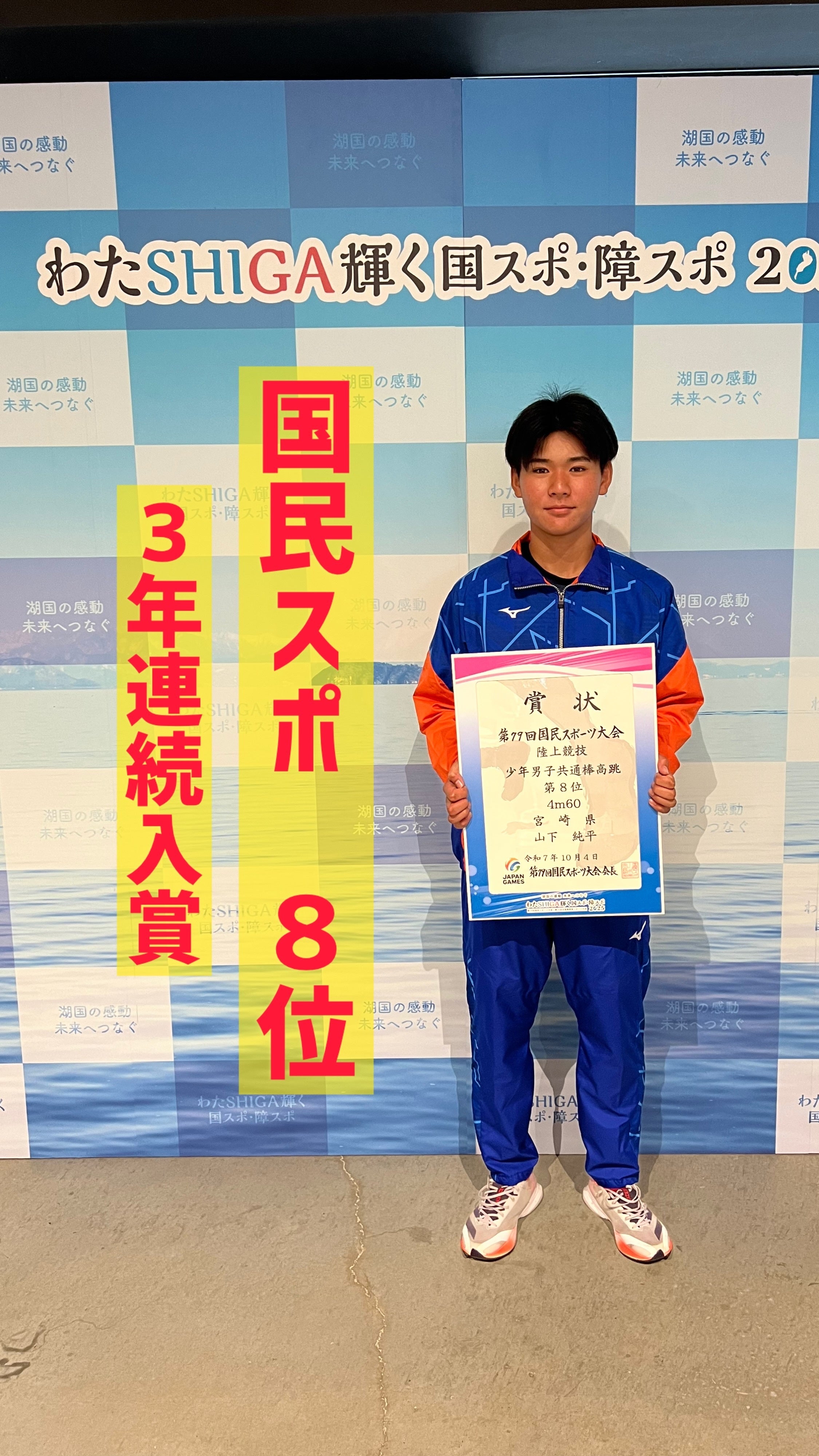 2025/10/08 15:1010月4日に滋賀県彦根市で国民スポーツ大会が行われました。本校2年生の山下純平が少年共通男子棒高跳に出場し、見事8位入賞を果たしました。記録は4m60でセカンドベストでした。(ベスト記録は4m61)中学時代のベスト記録は3m60で全国大会の経験はありません。しかし、高校で努力を重ね、今年のインターハイで初の全国大会を経験し、自信を持って今大会に臨みました。当日は雨で難しいコンディション。実力が上の選手でもバーを落とす中、山下は落ち着いて跳躍することができました。直前に行ったスプリントトレーニングの効果もあり、雨の中でも助走のスタート位置を80cmも遠くにしました。それだけしっかり走れていました。4m50を2回目でクリアした後、4m60からはポールを硬いものに変化。攻めのポール選択で、4m60を2回目でクリアすることができました。ただ、このポールは本校のものではなく他校からお借りしたものです。今回のご支援を彼や他の選手の将来に繋げていきたいと思います。 もっと見る