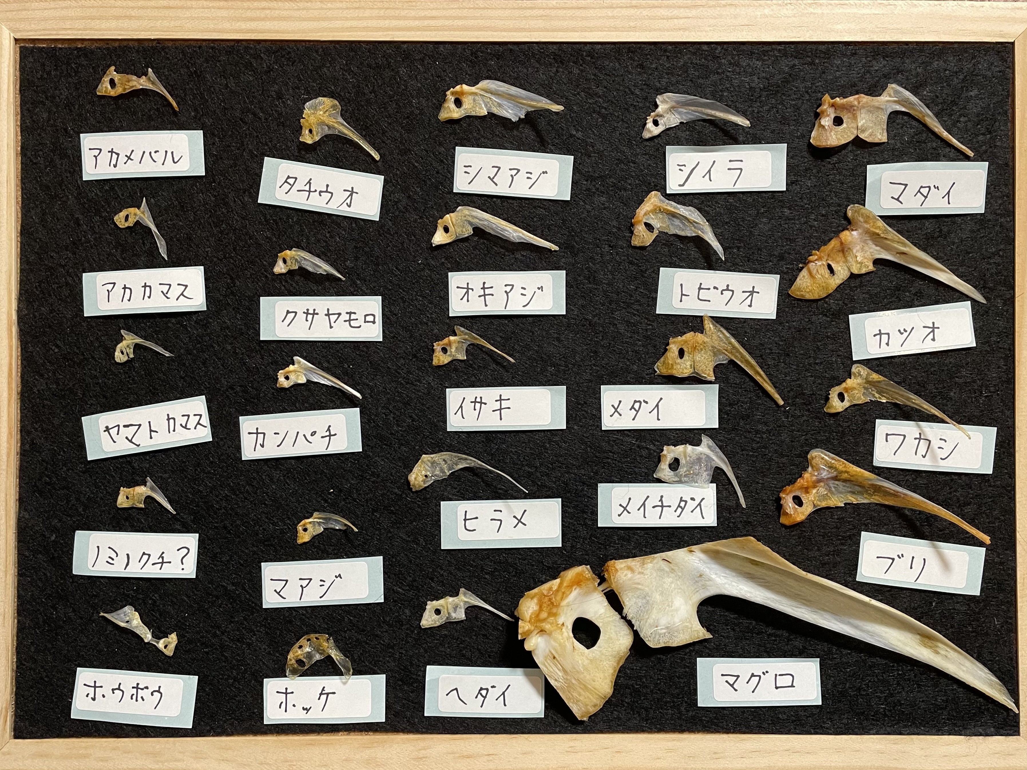 きっかけは、おばあちゃんの家に飾ってあった一つの「鯛の鯛」。これはキンメダイのものでしたが、どの魚にもある骨だと知り、「比べてみたい!」と思ったことから始まりました。