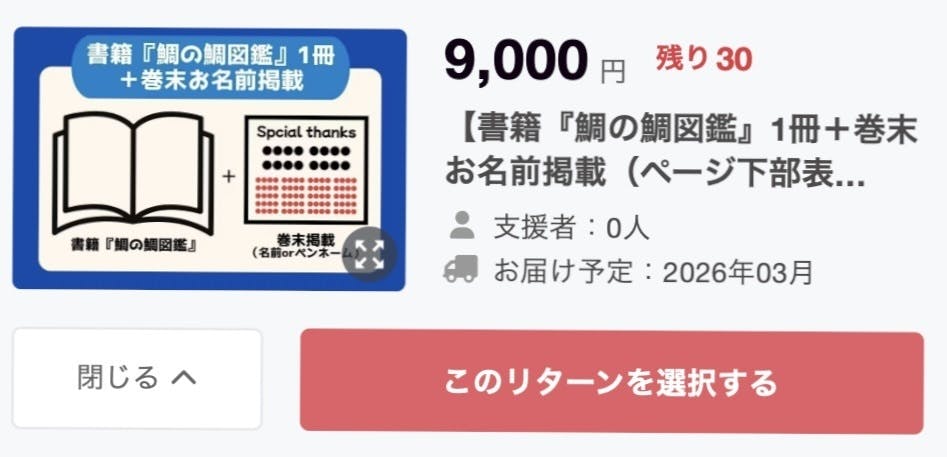 『鯛の鯛図鑑』への応援ありがとうございます!現在 3月出版を目指している『鯛の鯛図鑑』は自主出版の予定で進めておりますそのため、一般の書店での販売の予定はありません(販売方法、販売場所は現在検討中です)また今回の出版後、完売した際の再出版も現在のところ予定しておりませんなので、確実に『鯛の鯛図鑑』書籍版を手に入れたい方は、クラウドファンディングでのご支援をご検討お願いします!