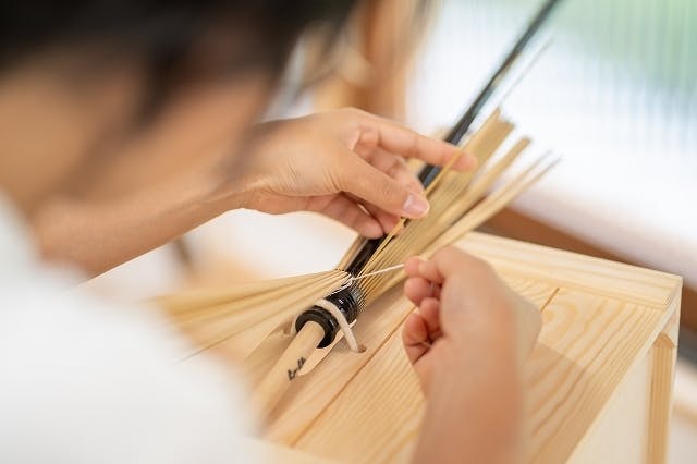 傘骨の補強と美しい装飾を与える糸かがり、頭紙、籐巻、石突など付属品の最終仕上げ工程を完全に習得します。2年間の学習の集大成として、和傘を完成させ、講師陣による厳正な評価を受けます。