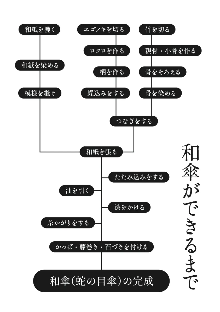 一本の和傘を生み出すには、骨を組む、紙を張る、糸をかがるなど、そのすべての工程ごとに何人もの職人の技が必要です。技と心が重なり合って、ようやく一つの和傘が完成します。