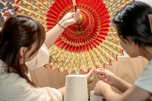 傘骨の補強と美しい装飾を与える糸かがり、頭紙、籐巻、石突など付属品の最終仕上げ工程を完全に習得します。2年間の学習の集大成として、和傘を完成させ、講師陣による厳正な評価を受けます。