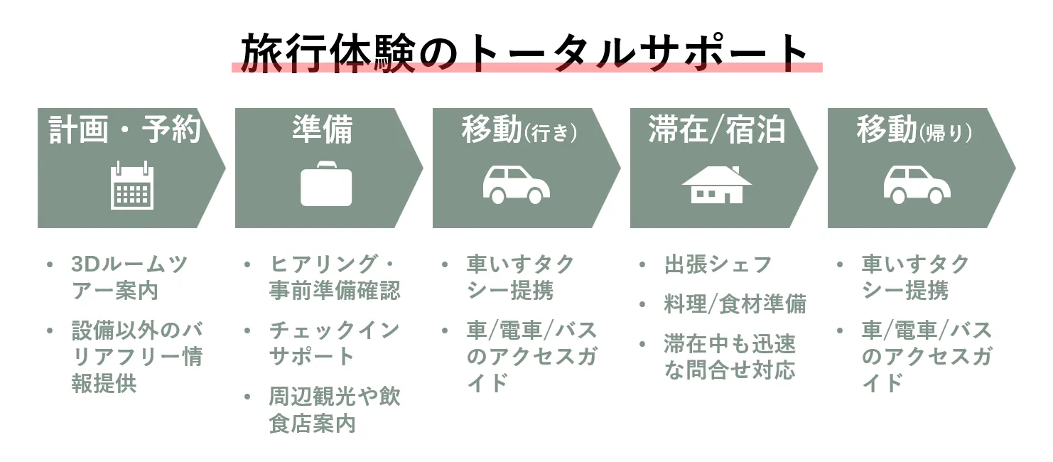 「宿泊」だけでなく、「移動」「食事」のサポートオプションも検討中です。さらに、周辺の観光スポットやレストランについても、バリアフリー情報をご案内し、九十九里エリアの「観光」も含めた旅行体験をサポートいたします。