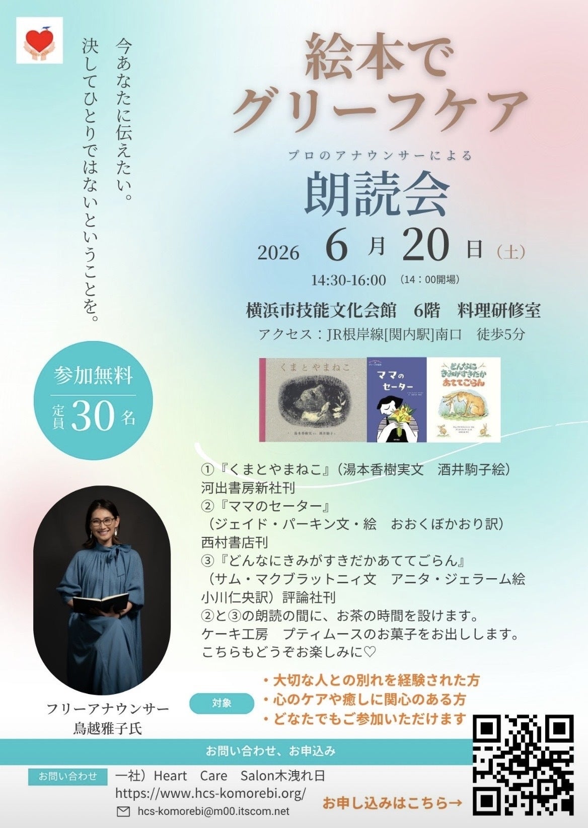 大切な人との別れを経験された方はもちろん、絵本がお好きな方、朗読に興味のある方など、どなたでもご参加いただけます。ぜひお越しください。