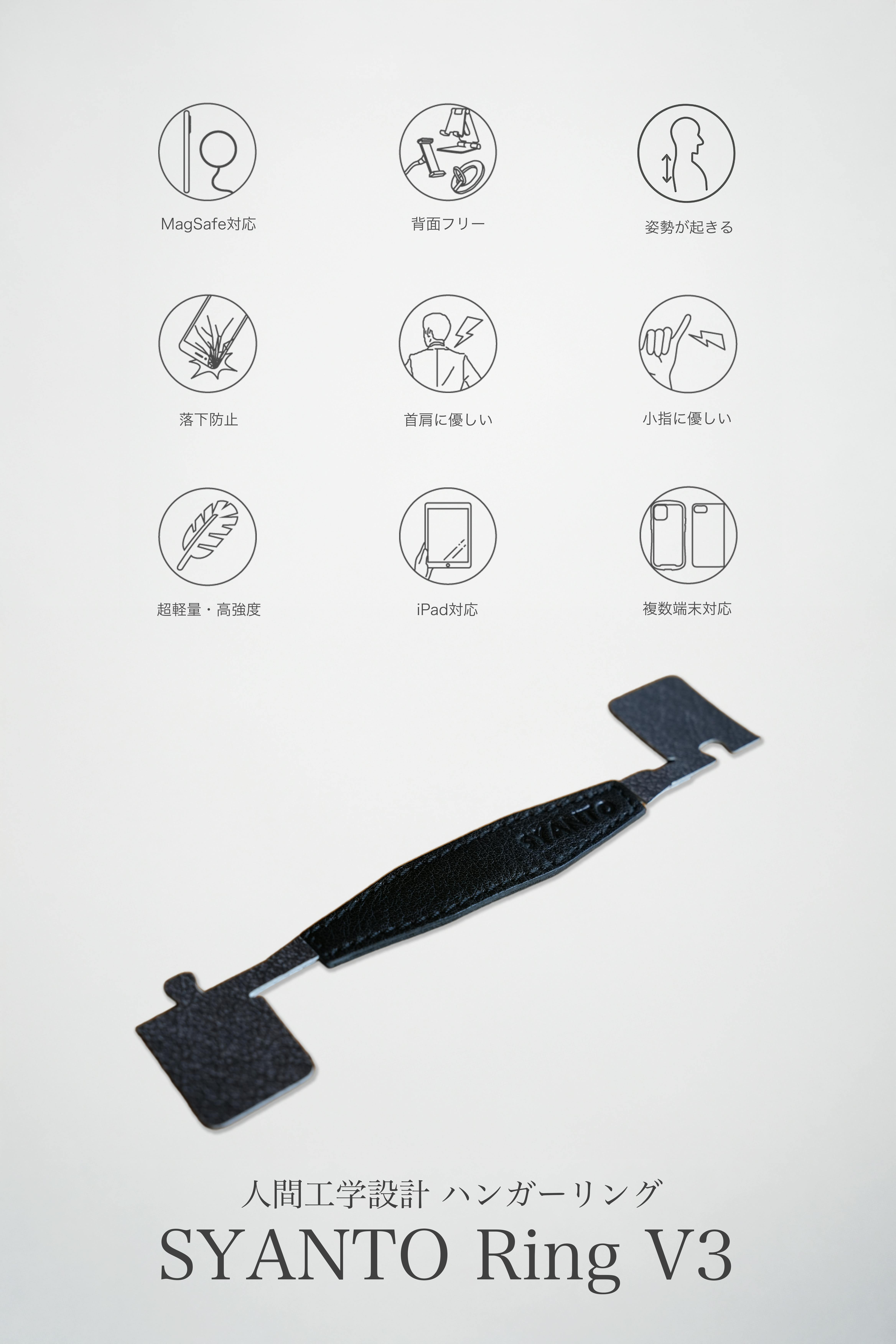 SYANTOは、スマホを「吊るして持つ」特許構造を採用。握らずに支えることで、手指・手首・肩・首への負担を大きく軽減します。