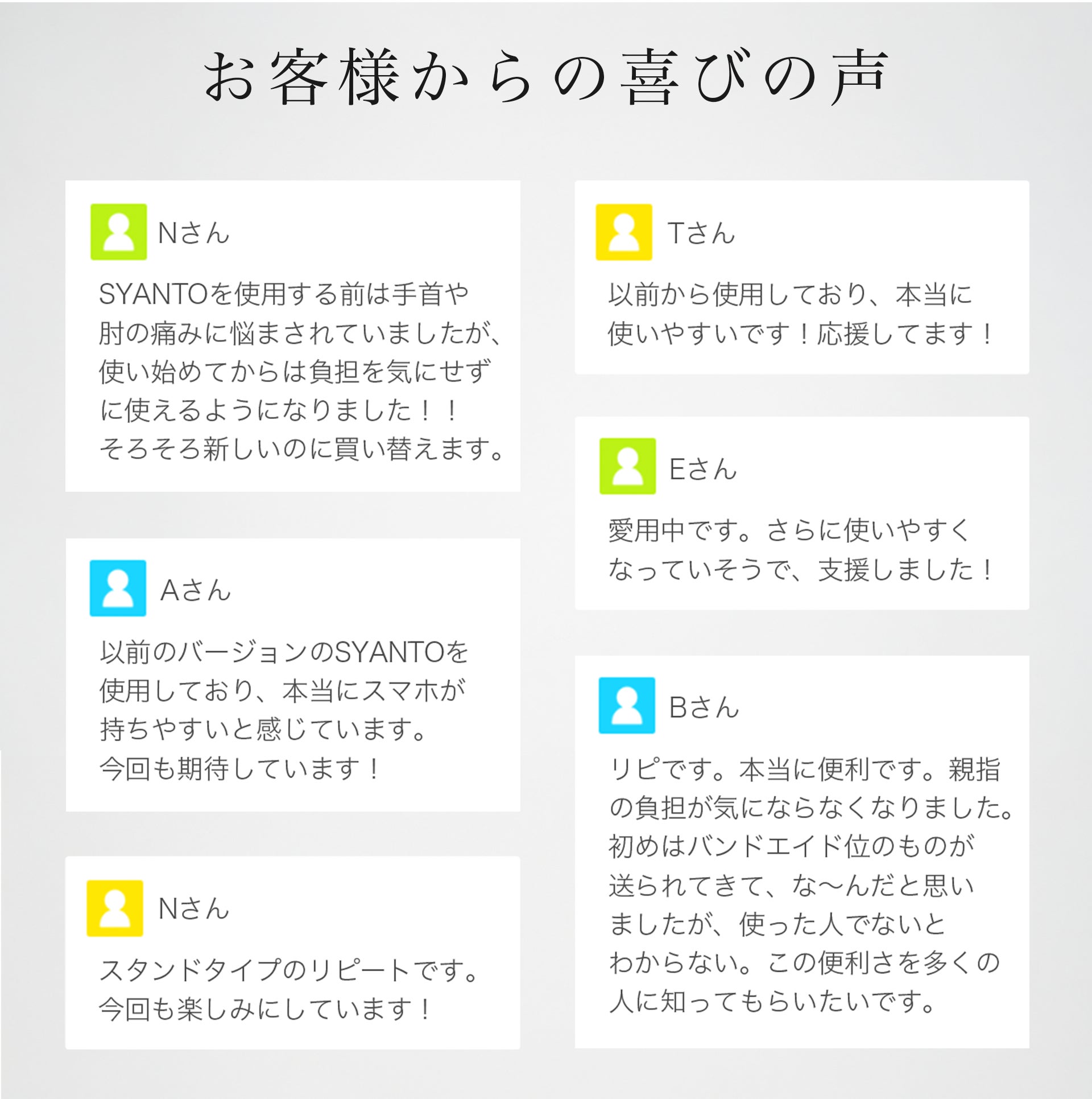 SYANTOはこれまでにMakuake、CAMPFIRE、米国kickstarter、Amazonで累計2.3万個以上のご支援をいただき、多くの方のスマホ操作の悩み解決に貢献してきました。