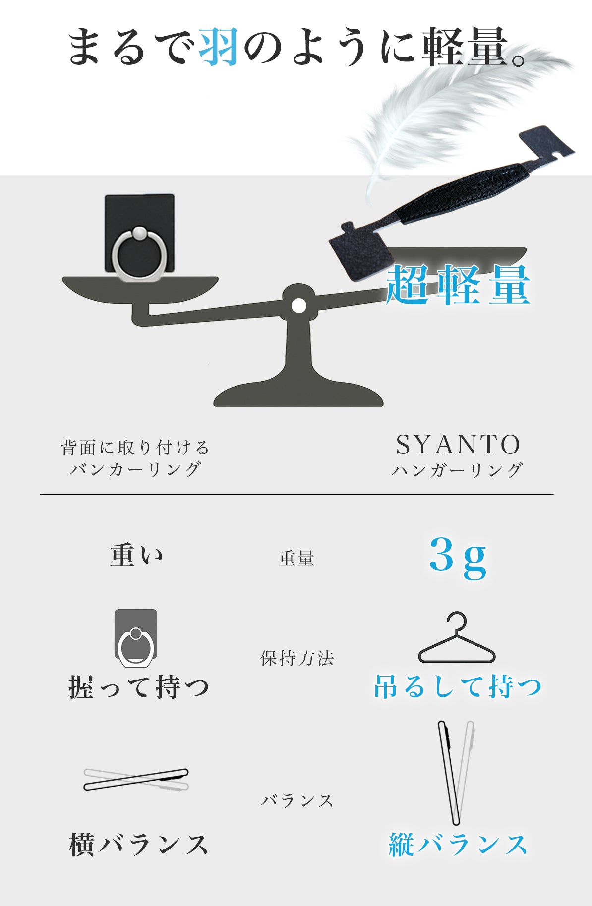 SYANTOはこれまでのスマホリングとは全く異なり、わずか3gの超軽量を実現し、非常に優れたスマホの操作体験を提供します。