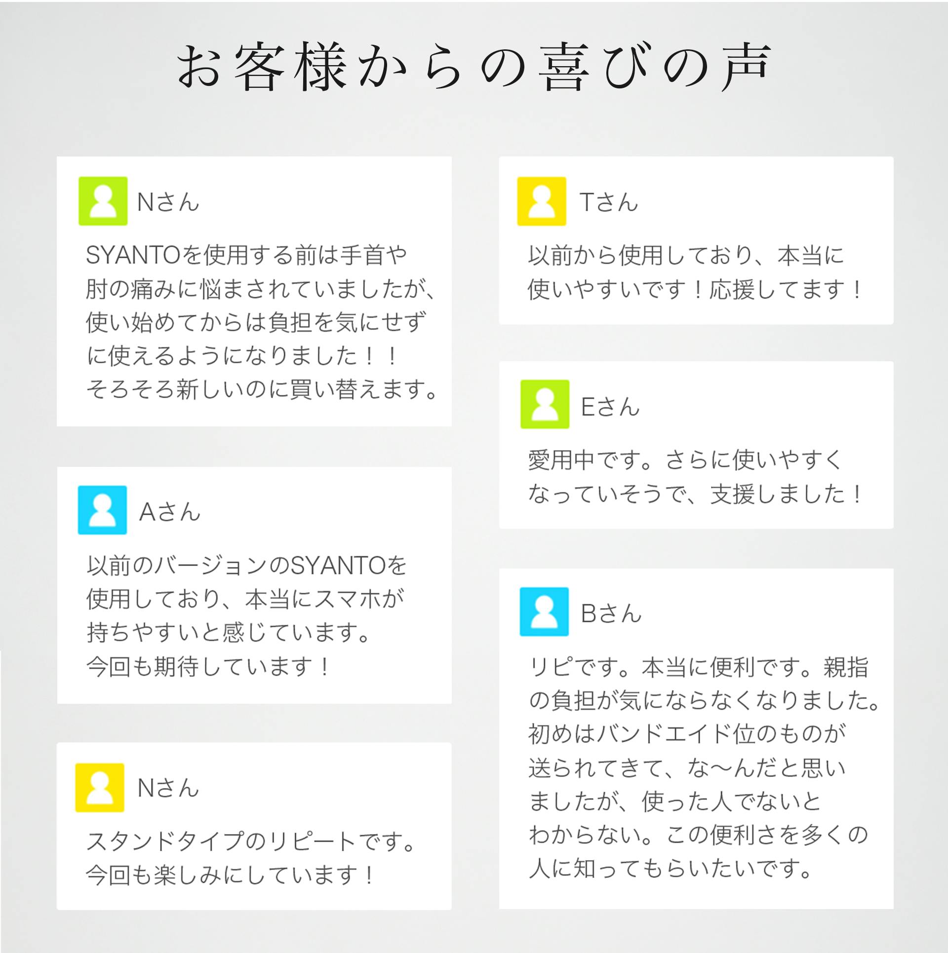 SYANTOはこれまでにMakuake、CAMPFIRE、米国kickstarter、Amazonで累計2.3万個以上のご支援をいただき、多くの方のスマホ操作の悩み解決に貢献してきました。