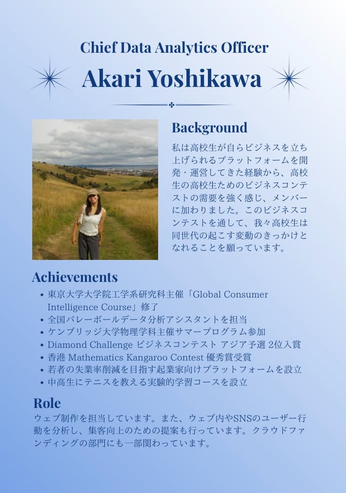 起業、海外在住、インターンシップ、ボランティアという多様な経験が集まったメンバーの私たちは、高校生のポテンシャルを、誰よりも知っています。また、複数のビジコンへの参加経験がある中、高校生独自の発想力の大きさ、そして創造性を大いに感じました。