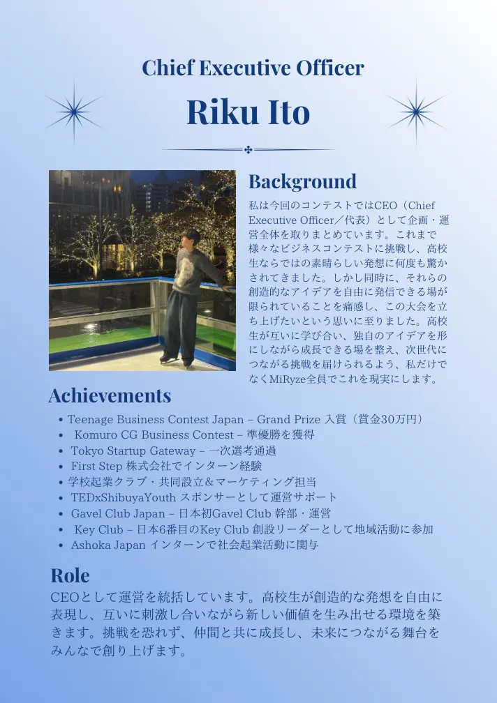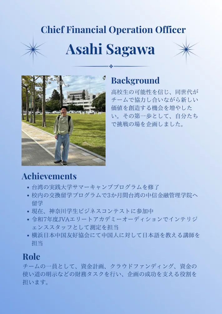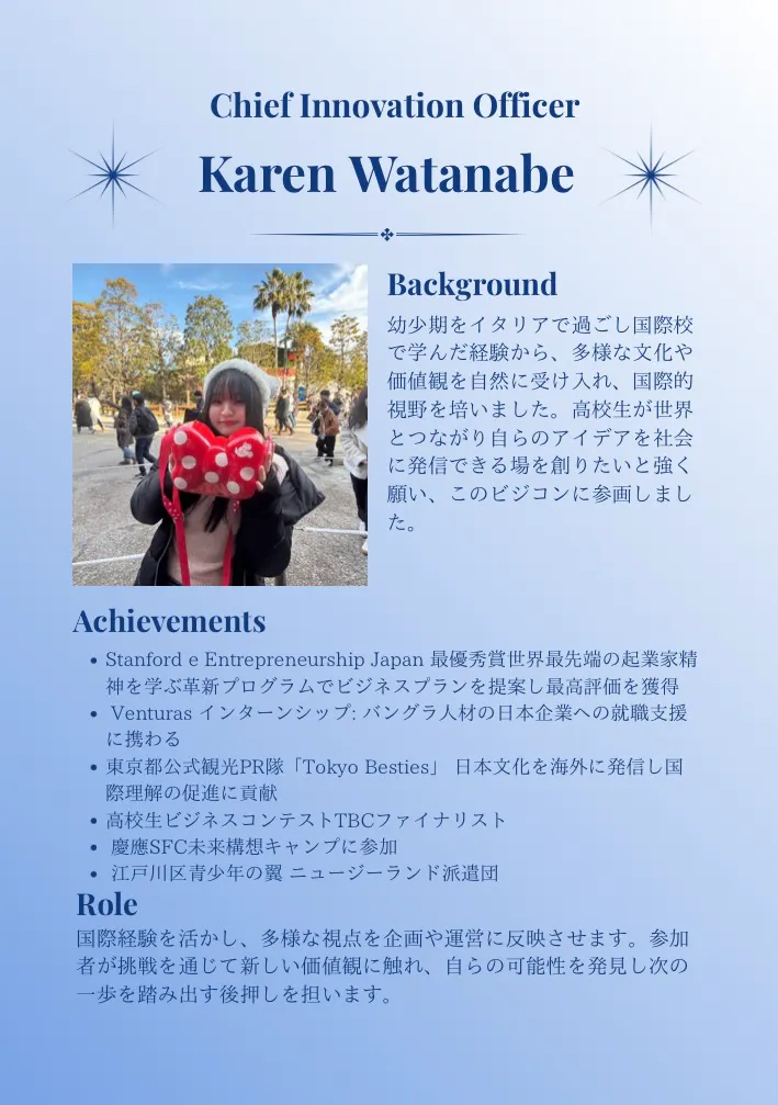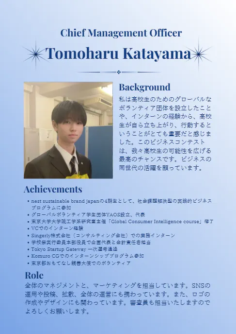 高校生にしかできない視点で、世界初の“本気の青春ビジコン”を、ここから始めます。 私たちと一緒に、新しい時代の一歩を踏み出しませんか?