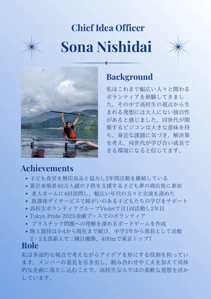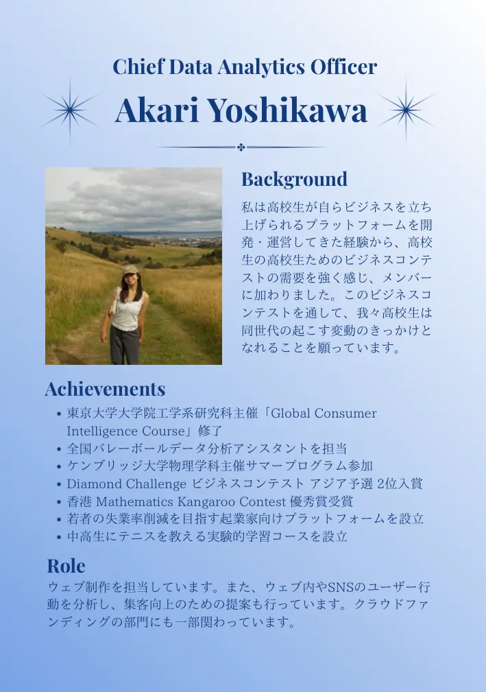 起業、海外在住、インターンシップ、ボランティアという多様な経験が集まったメンバーの私たちは、高校生のポテンシャルを、誰よりも知っています。また、複数のビジコンへの参加経験がある中、高校生独自の発想力の大きさ、そして創造性を大いに感じました。