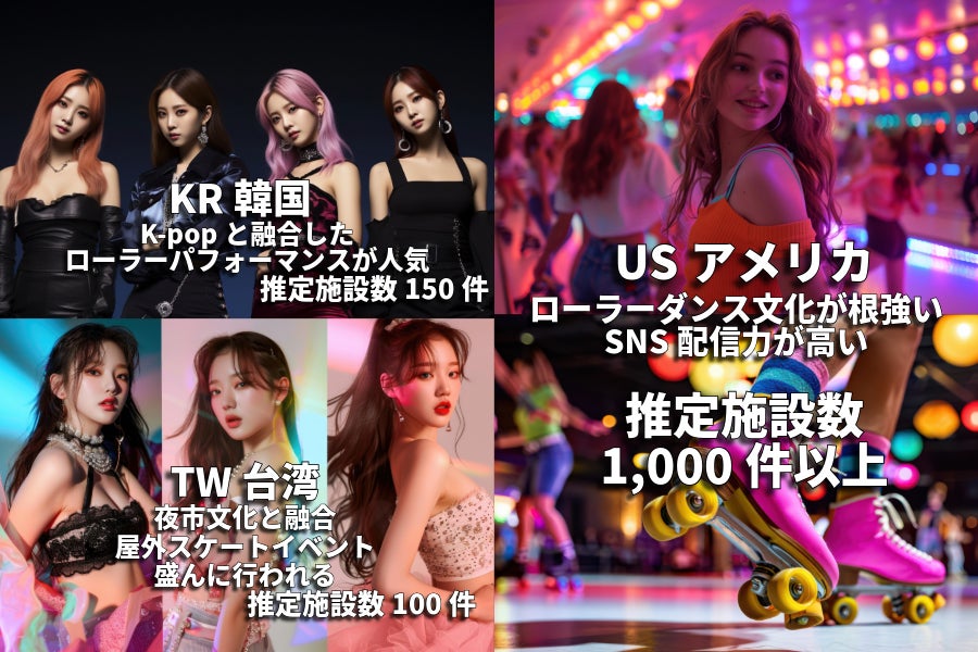 USアメリカ:ローラーダンス文化が根強く、SNSでの配信力が高い 約1,000施設以上