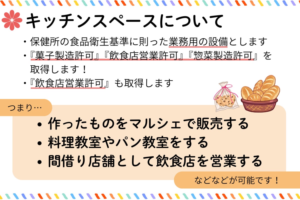 菓子製造許可、飲食店営業許可、惣菜製造許可を取得予定なので、その場で作ったものを販売したり、間借り店舗として飲食店を開いたりすることができます。