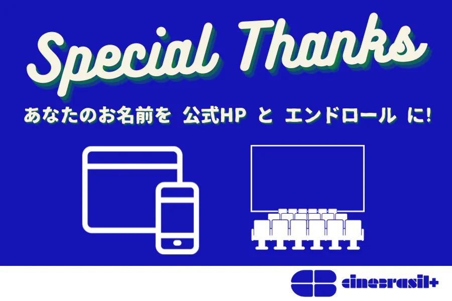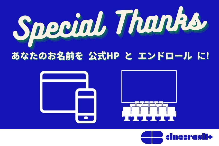 ・映画祭公式ホームページ内の⽀援者欄+ ⽀援者として映画本編終了後のエンドロールに掲載 ※お申込みの際に、掲載を希望されるお名前を記述していただきます。