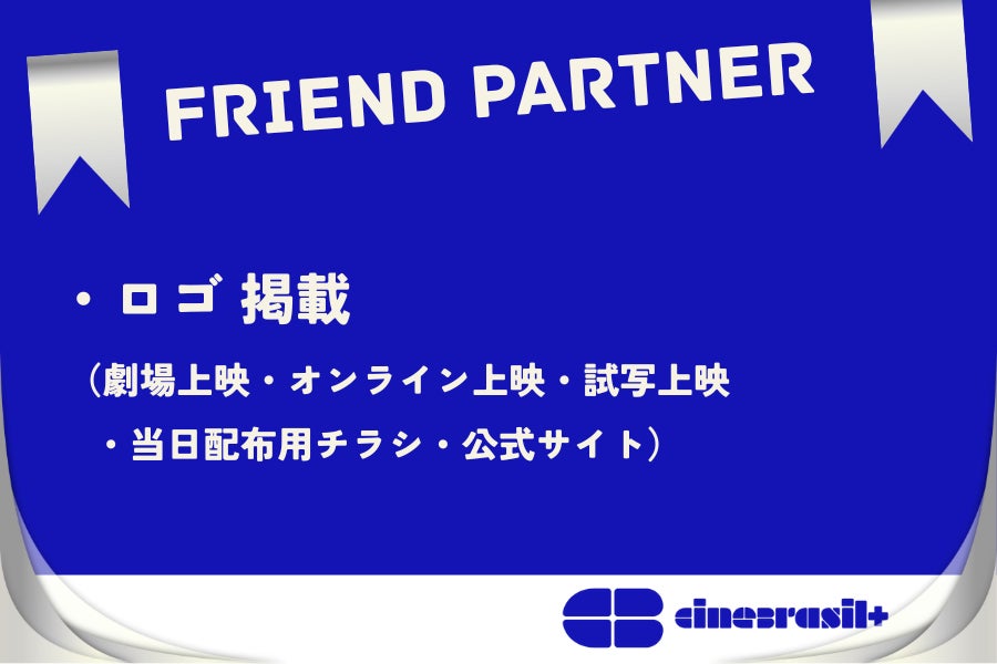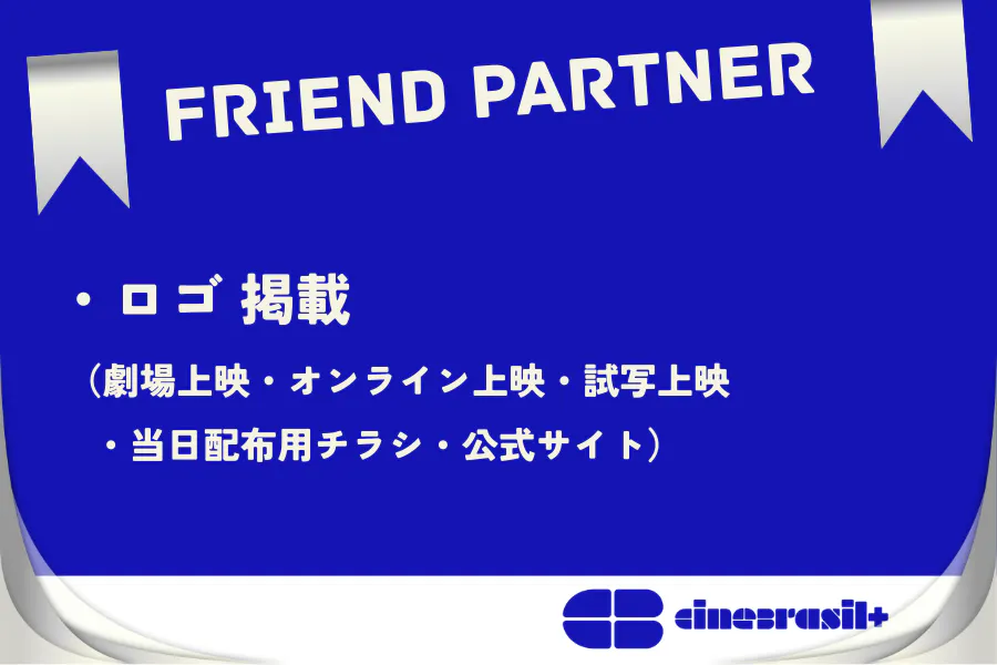 ・cinebrasil+ ロゴTシャツ(シルクスクリーン印刷) + 映画祭公式ホームページ内の⽀援者欄 + ⽀援者として映画本編終了後のエンドロールに掲載