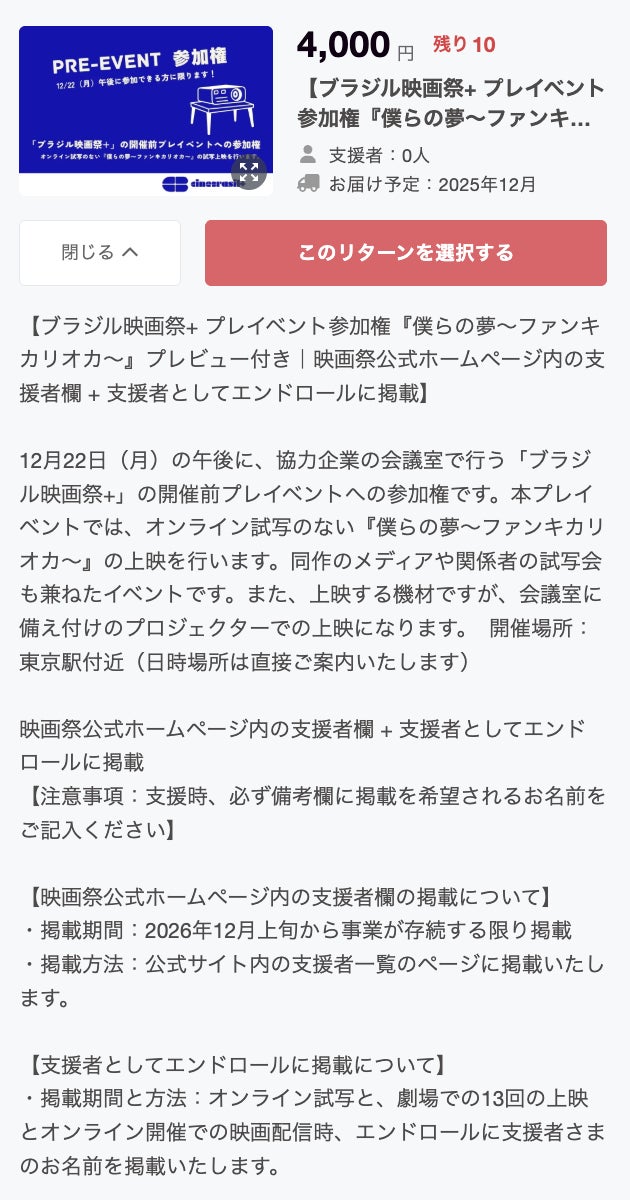 企画メンバーが地方在住で、実際に集まる場でのリターンがありませんでしたが、『僕らの夢〜ファンキカリオカ〜』の上映を行うプレイベントができることになりました。僕らの夢〜ファンキカリオカ〜』はオンライン試写のない作品になります。
