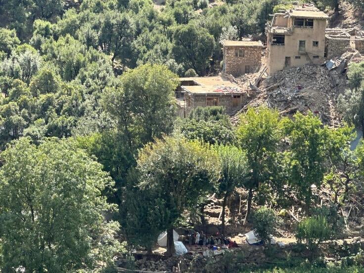 地震で家が崩壊し、住民はテントに避難(9月6日、クナール州チャラス地域にて)