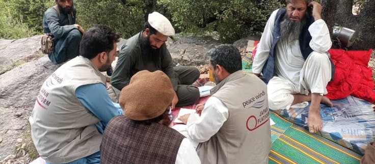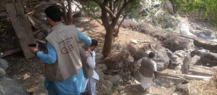 被災者の元に足を運んで聞き取り調査を行った(9月6日、クナール州チャラス地域にて)