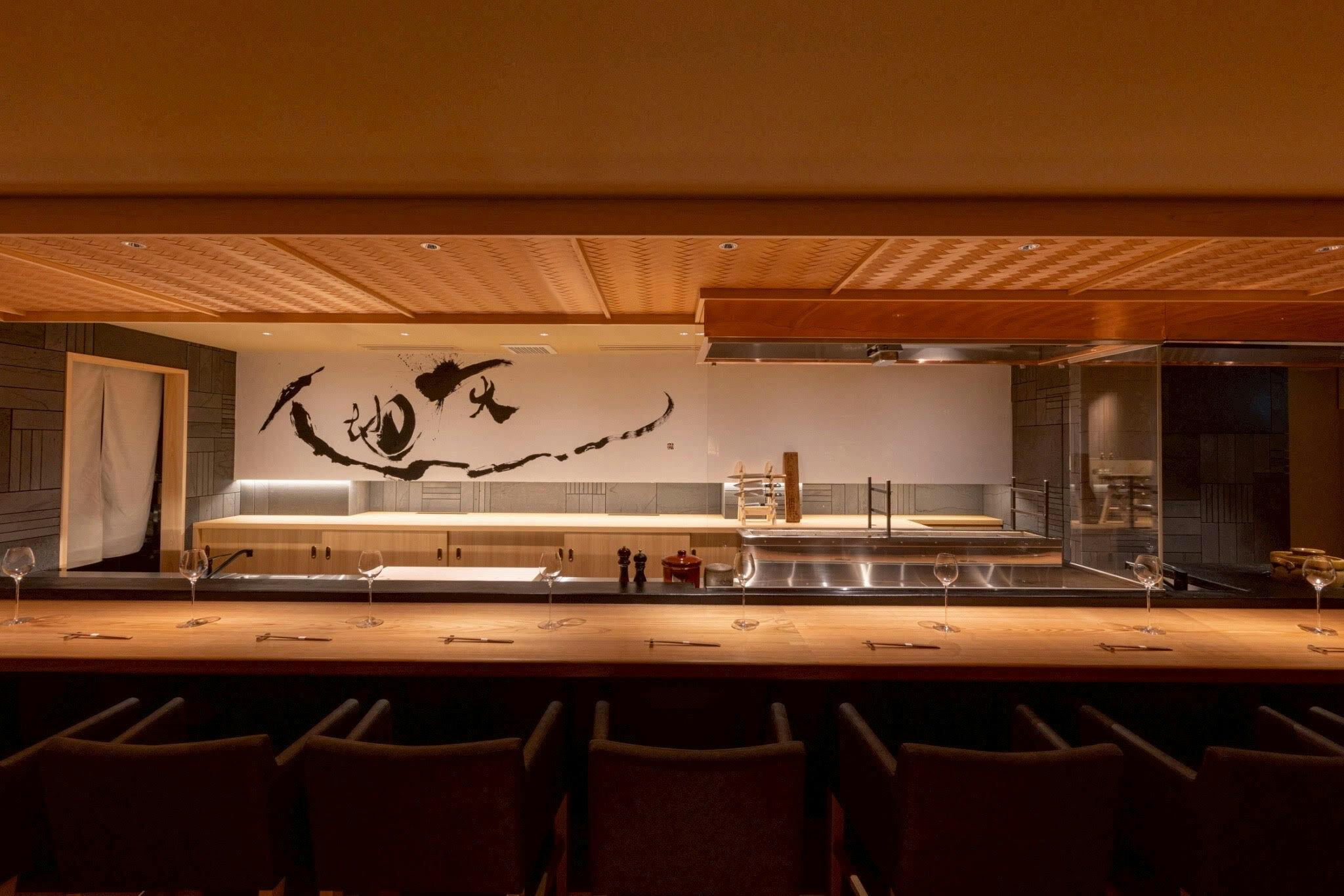 盛り付け台と焼台をメインとし、カウンター木材は【京都 北山杉】の【赤身】。ぎっしり目地の詰まった素晴らしい材を京都・伏見【丸萬】様に選んでいただきました。背景には書道家CHIFUMI様による書をオープン前に生ライブで書いていただきます。