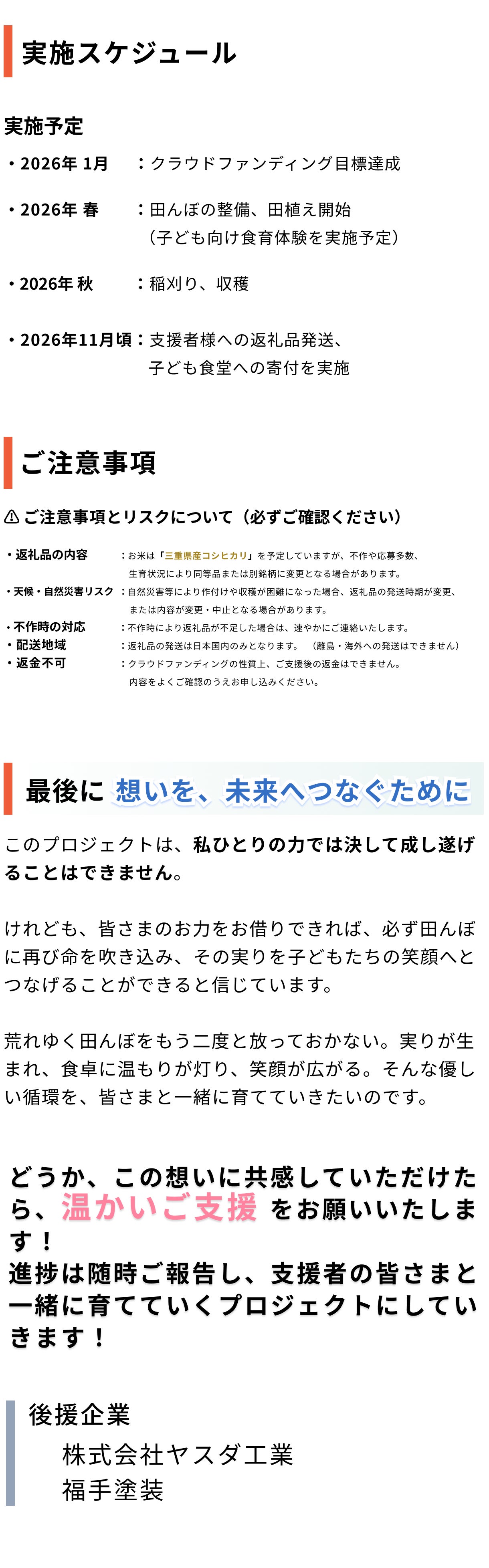 2025/11/07 18:30【報告】あぜ道の除草作業完了!安全なお米作りに欠かせない一歩皆さま、いつも温かいご支援ありがとうございます。主催者の高島です。 本日、地元の田んぼのあぜ道(農地と道路の境目)の雑草処理を行いました!• 安心なお米を子どもたちに届けるため、手間はかかりますが、この除草作業はとても重要です。• しっかりと管理することで、病害虫を防ぎ、稲が健やかに育つ環境を守っています。この土地で育てたお米は、子ども食堂に寄付されます。子どもたちが安心できる食を届けるため、一つ一つの作業に心を込めて取り組んでいます。 収穫(9月頃を予定)に向けて、これからも大切に育ててまいりますので、引き続き応援よろしくお願いいたします! 目標金額:150万円(2026年1月下旬まで) もっと見る