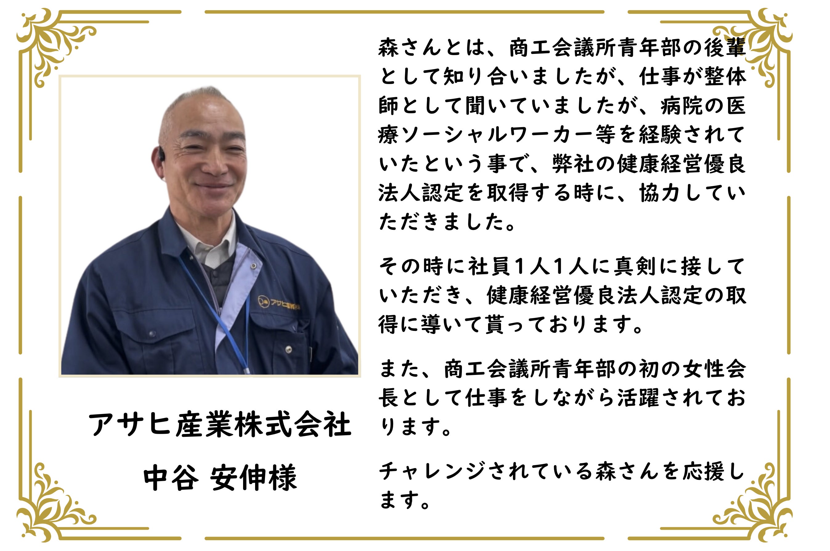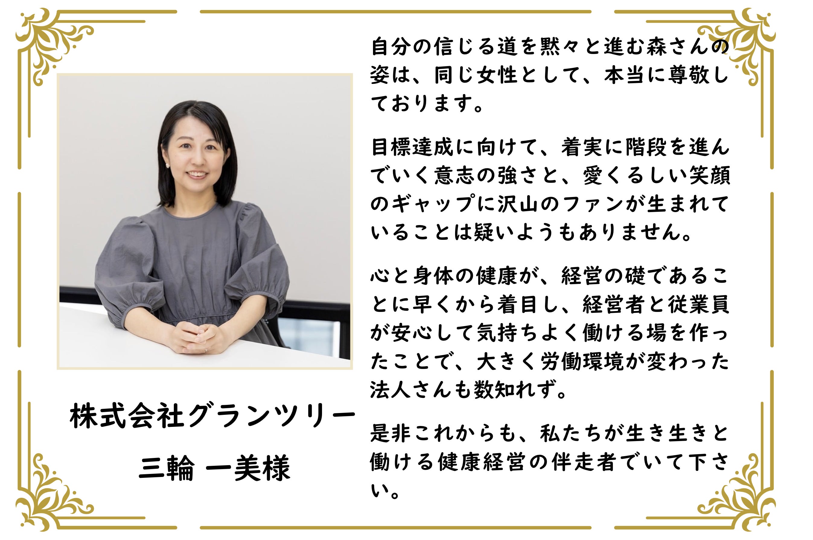 私は「健康がすべてではないが、健康を害すればすべてを害する」という考えを軸に、中小企業に合った制度運用の形を共に探し、働きやすい職場を広げていきたいと思います。