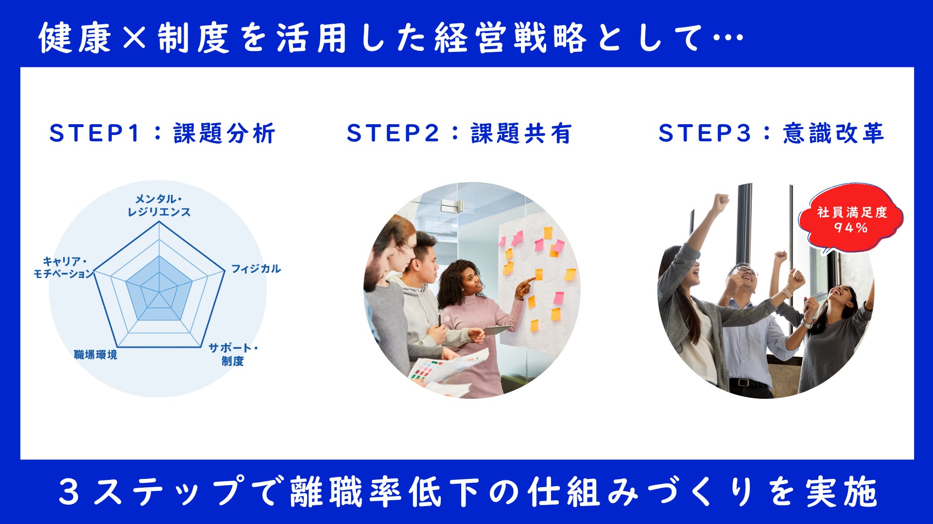 「健康×制度を活用した経営戦略」として、“3ステップで離職率を低下させる仕組みづくり”を構築しています。