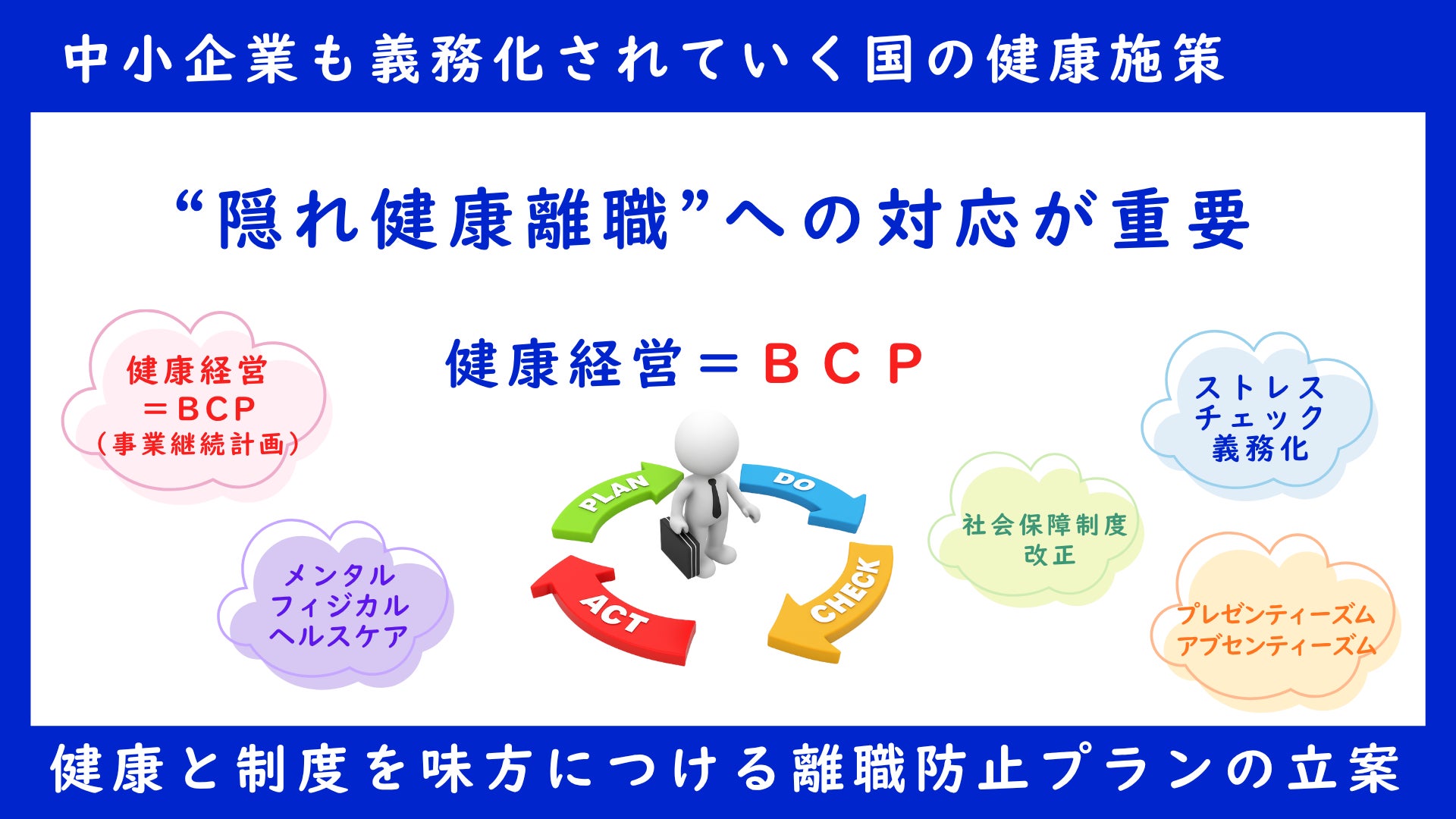 こうした流れの中で、国も中小企業への健康施策を強化しており、2028年までには社員50名未満の企業にもストレスチェックが義務化されます。中小企業も例外ではなく、健康経営はもはや「経営戦略」や「BCP(事業継続計画)」の一部として位置づけることが必要です。