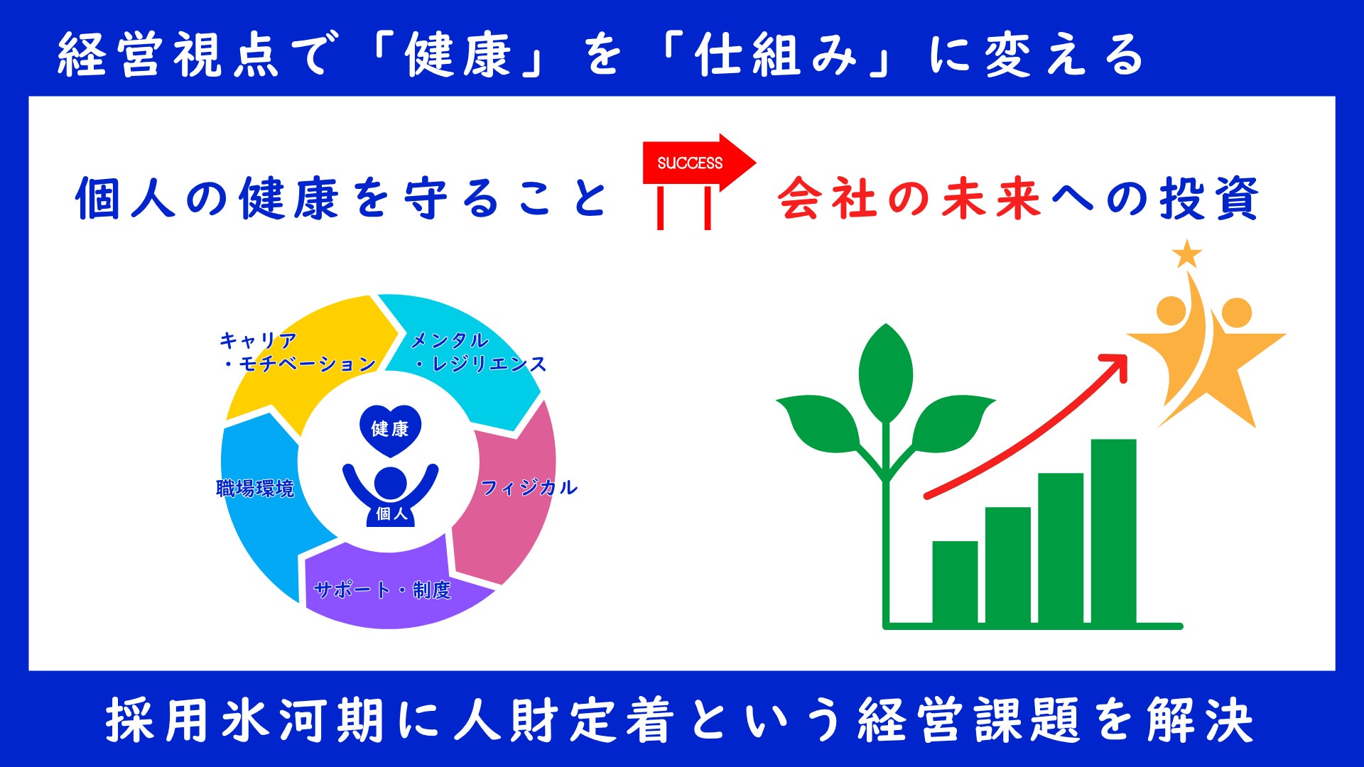 健康経営は未来への先行投資。「健康が不要になる日」は決して来ません。だからこそ、“いま”から健康×制度を活用し、離職防止への取り組みをはじめることが最大の成長へのチャンスです。