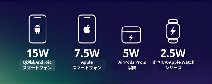 底面にワイヤレス充電パッドを内蔵しており、Qi 対応の Android スマートフォン、iPhone、Apple watch、Airpods をすっきりと充電できます。シリコン製の滑り止めパッドにより、充電中にスマートフォンがしっかりと固定されます。
