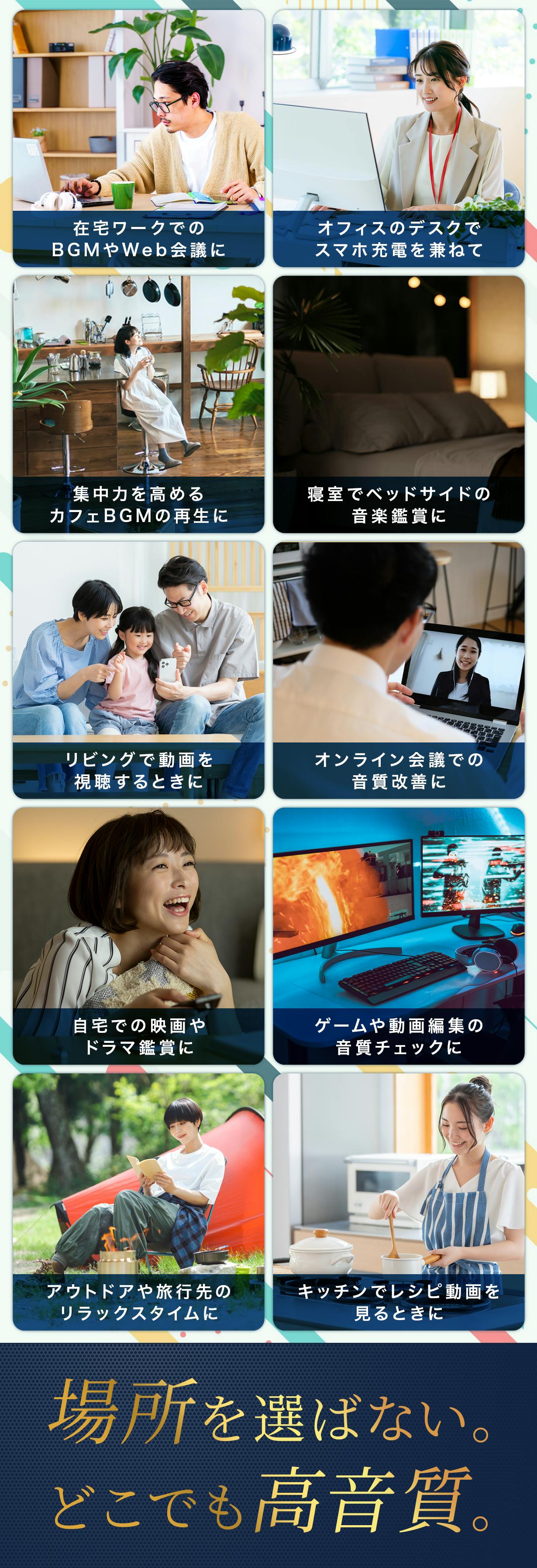 デスクワーク中のBGMや動画視聴、オンライン会議など、自宅で過ごすあらゆる時間をプレミアムな音質で彩ります。