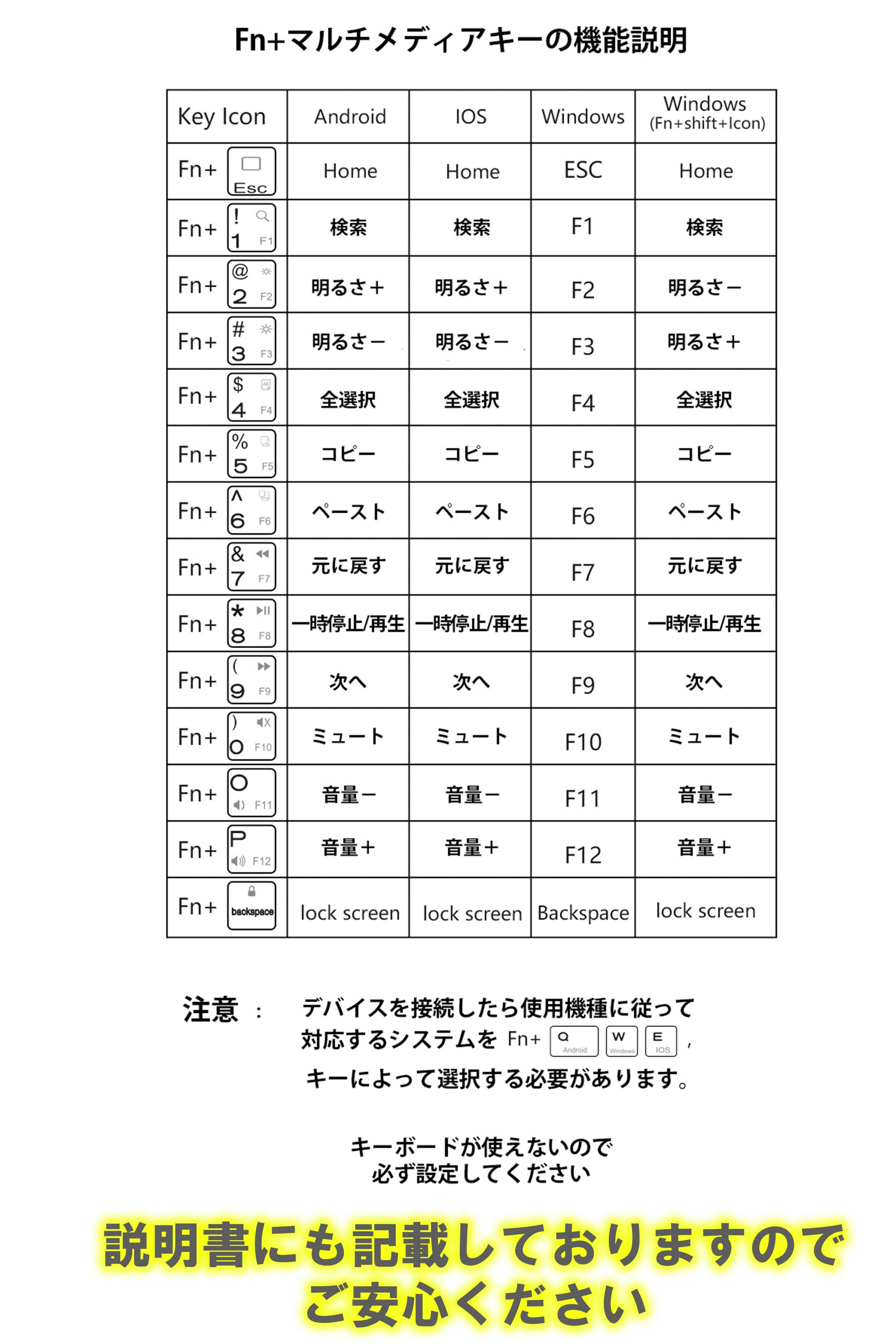 Fn+マルチメディアキーの機能説明一覧表も書いてある、使い方詳細記載した説明書がついておりますのでご安心ください。