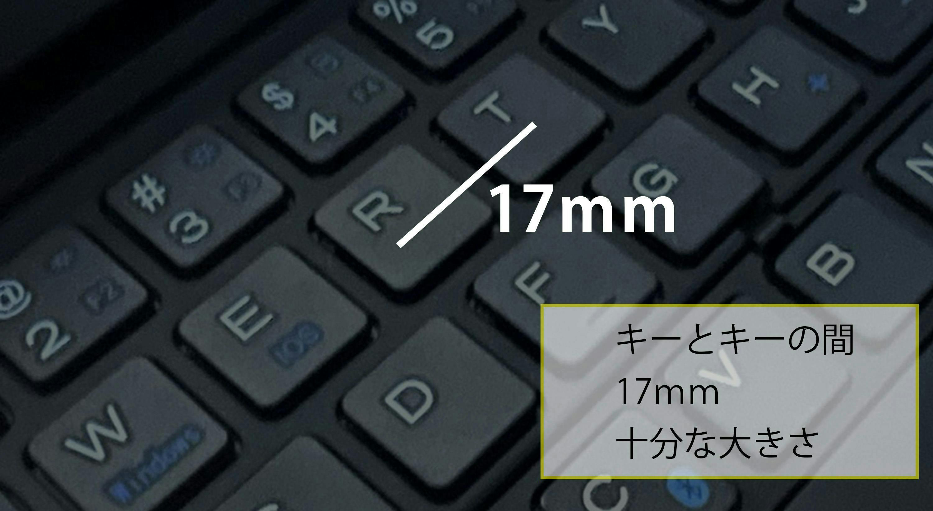 キーのサイズ、キーとキーの間の距離にもこだわりました。コンパクトでも打ちにくかったら意味がありません。コンパクトと打ちやすさを追求して、行きついたのがこの「17mm」です。