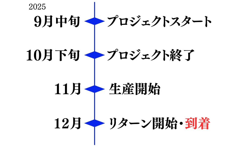 ※本文中に記載させていただいたスケジュールは、あくまでプロジェクト公開時点の予定です。支援購入の性質上、配送遅延のおそれがございます。