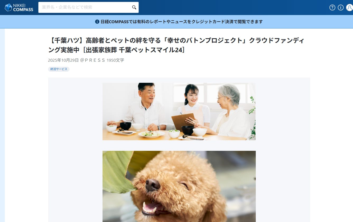 この度、私たち「出張家族葬 千葉ペットスマイル24」と「幸せのバトンプロジェクト」の取り組みが、日本経済新聞に掲載されました!