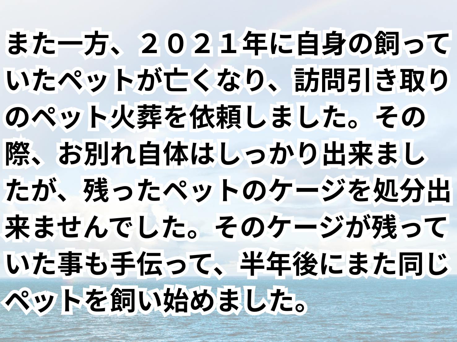 「これが、私自身が高齢者で最期に飼うペットだった場合、残ったケージを見て次のペットを迎えたくなった場合。新たに迎えたペットを最後まで飼育出来ないのではないか」