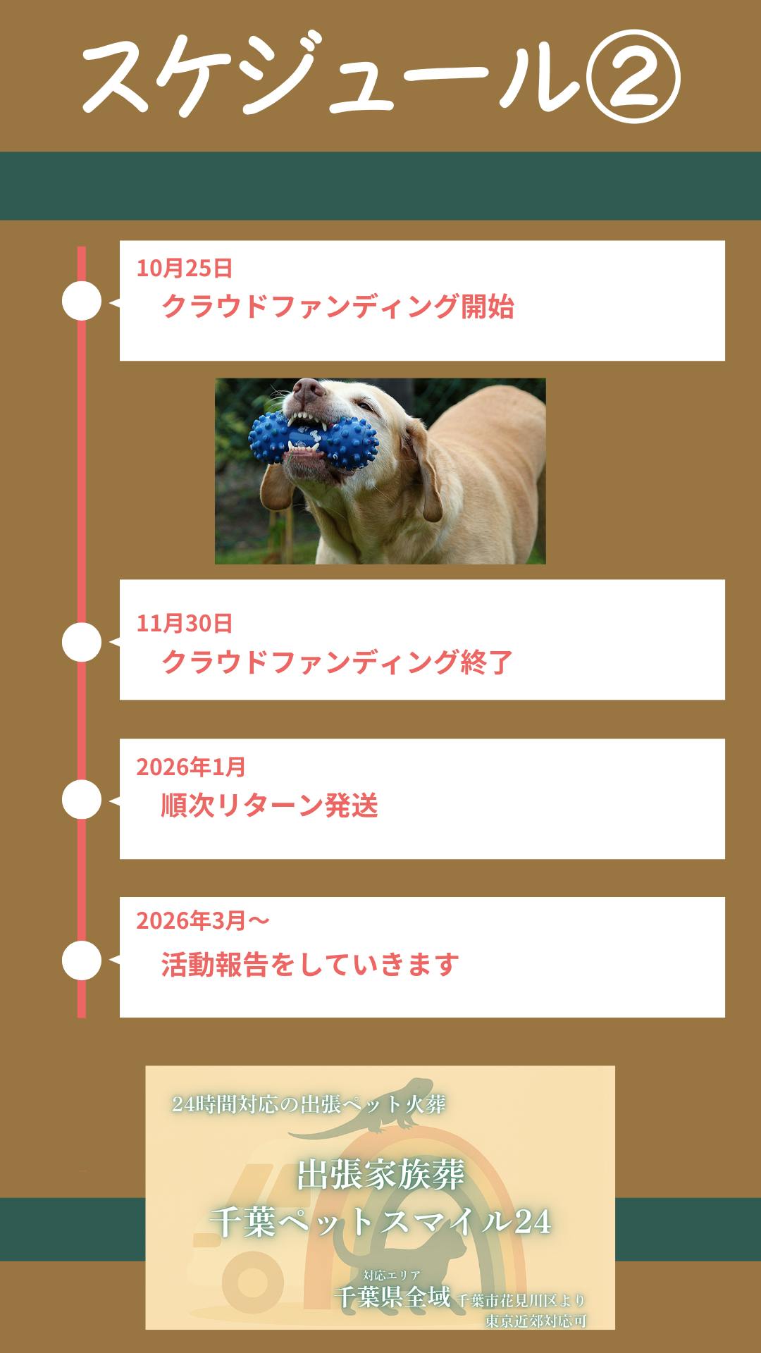 2025/11/30 22:00プロジェクト期間中、おそらく最後の投稿となります。※また文字ばかりですが、最後までお付き合いください。★命のバトンを繋いだ、すべての支援者様へ★この期間中、私たち出張家族葬 千葉ペットスマイル24の理念と、「幸せのバトンプロジェクト」の使命に共感し、ご支援と温かいメッセージをくださった全ての皆様に、心より深く感謝申し上げます。皆様一人ひとりのご支援は、単なる金額ではなく、「千葉のペットと飼い主様を最後まで見守りたい」という私たちの熱い決意を、確固たるものに変えてくれました。【法人向け】【感謝の証】※車内掲載名・敬称略2025/11/24 Star Throw合同会社(Webシステム開発で業務効率化・DX支援)【個人向け】【感謝の証】※車内掲載名2025/10/25 ショコラさん2025/10/26 石川さん2025/10/28 神田陽介さん2025/11/23 大室拓郎さん【珪藻土骨壺】2025/10/25 ckana0814さん2025/11/19 user_cf91d3642744さん2025/11/28 Rothkomamaさん【活動内容報告・お礼のメッセージ】2025/11/27 user_f3cd27353744さん2025/11/30 birdogさん【お礼のメッセージ】2025/10/27 JURApluzさん2025/10/29 梅原 恵さん2025/11/11 hosome_btbさん2025/11/28 chiisanatubasaさん2025/11/30 理学療法士 長澤 康彦さん15名の皆様、温かいご支援、誠にありがとうございました。★ここからラストスパート!★目標達成するまで残り39%。私たちは、最後の奇跡を信じています。この最後の瞬間まで、私たちは諦めません。私たちは、この活動を通じて①心の不安を安心に変えるという約束を果たすために、全力を尽くします。②遺品を希望に変えるという約束を果たすために、事業を継続します。改めてこちらを皆様へ誓います!残り時間わずか!今、あなたがこのメッセージを読んでいる瞬間にも、時間は刻々と過ぎています。どうか、支援を迷っているという方は、この最後の2時間に、私たちと共に奇跡を起こすための最後のひと押しをお願いいたします。プロジェクト終了後も、この活動報告を通じて、皆様にご支援いただいた資金がどのように使われたかご報告します。熱いご支援と、最後の拡散をお願いいたします! もっと見る