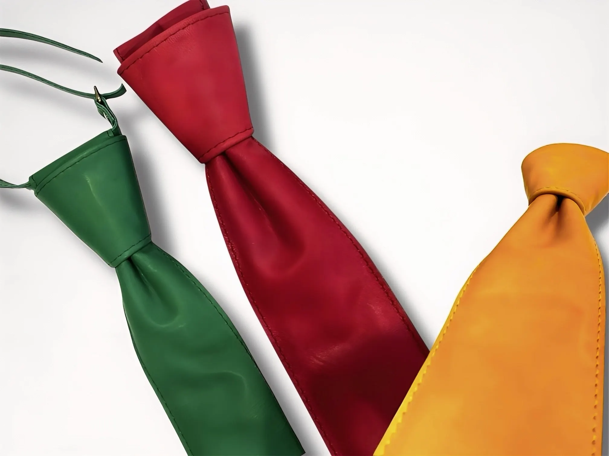 革製品の職人歴20年クラモトが仕掛ける「アガル↑レザー俱楽部」シリーズの第一弾、カラフルなレザーネクタイとチーフをお届けします。