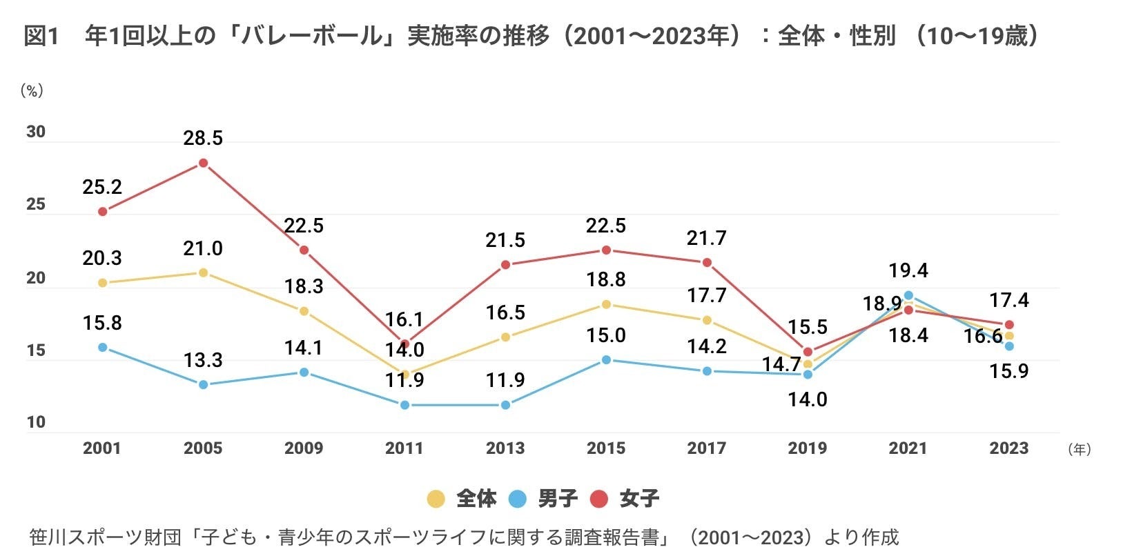 (笹川スポーツ財団"10代のバレーボール人口" 笹川スポーツ財団 https://www.ssf.or.jp/thinktank/sports_life/data/volleyball_teens.htmlより引用)