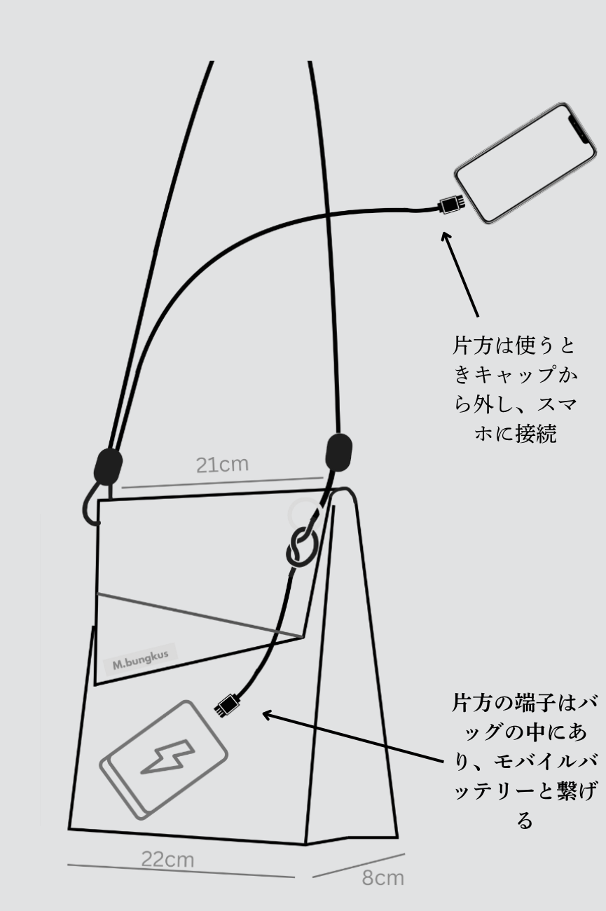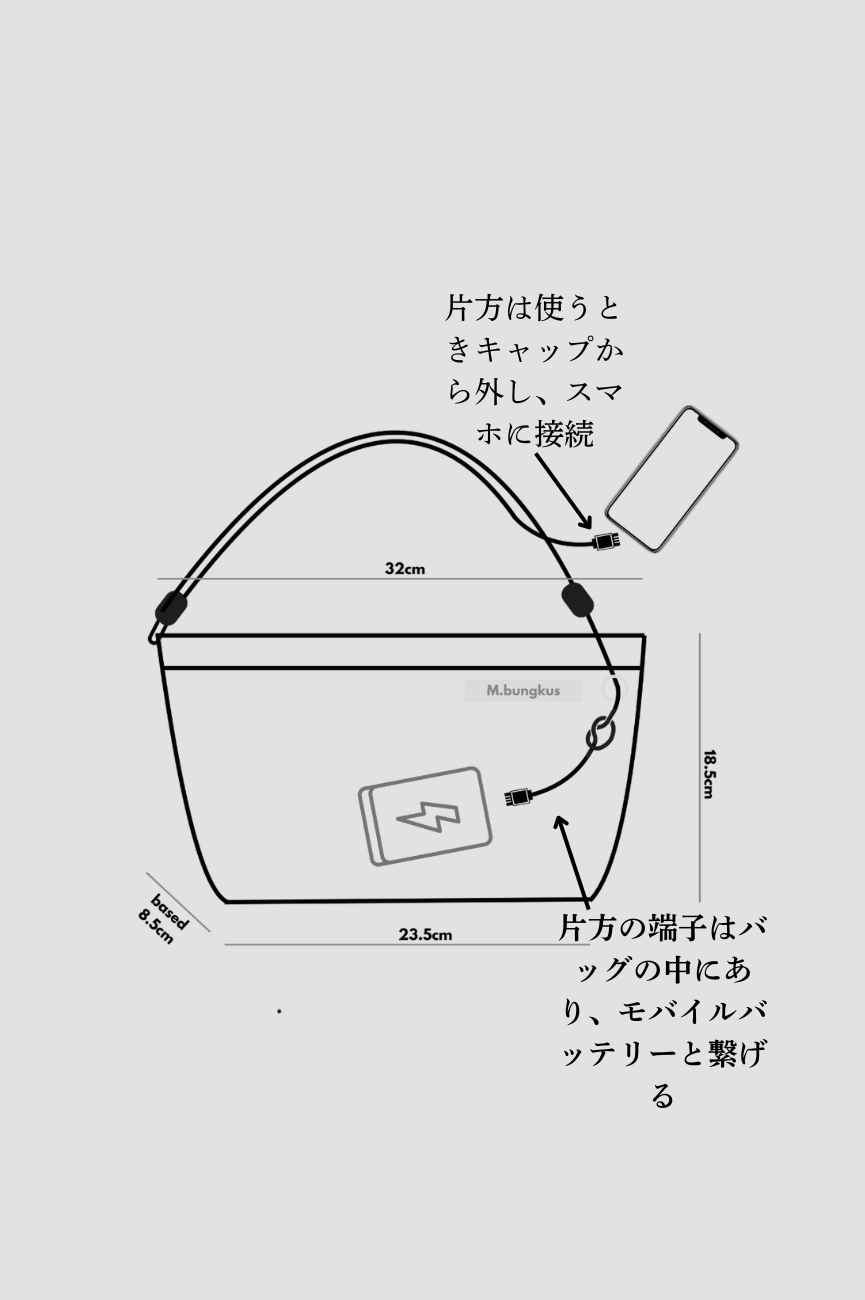 ・「バッグには充電機能は内蔵されていません。充電する際は、バッグの中にあるType-C端子にお手持ちのモバイルバッテリーをつないでご利用ください。」