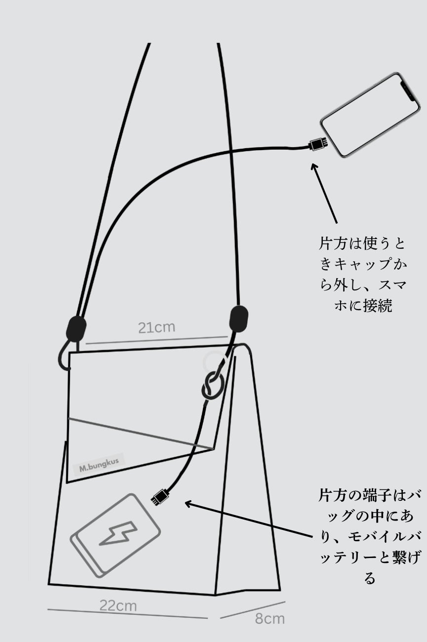 A. はい、ストラップの中にUSB-C充電ケーブルが内蔵されています。片方をモバイルバッテリーに、もう片方をスマートフォンに接続すれば、バッグをかけたまま充電が可能です。