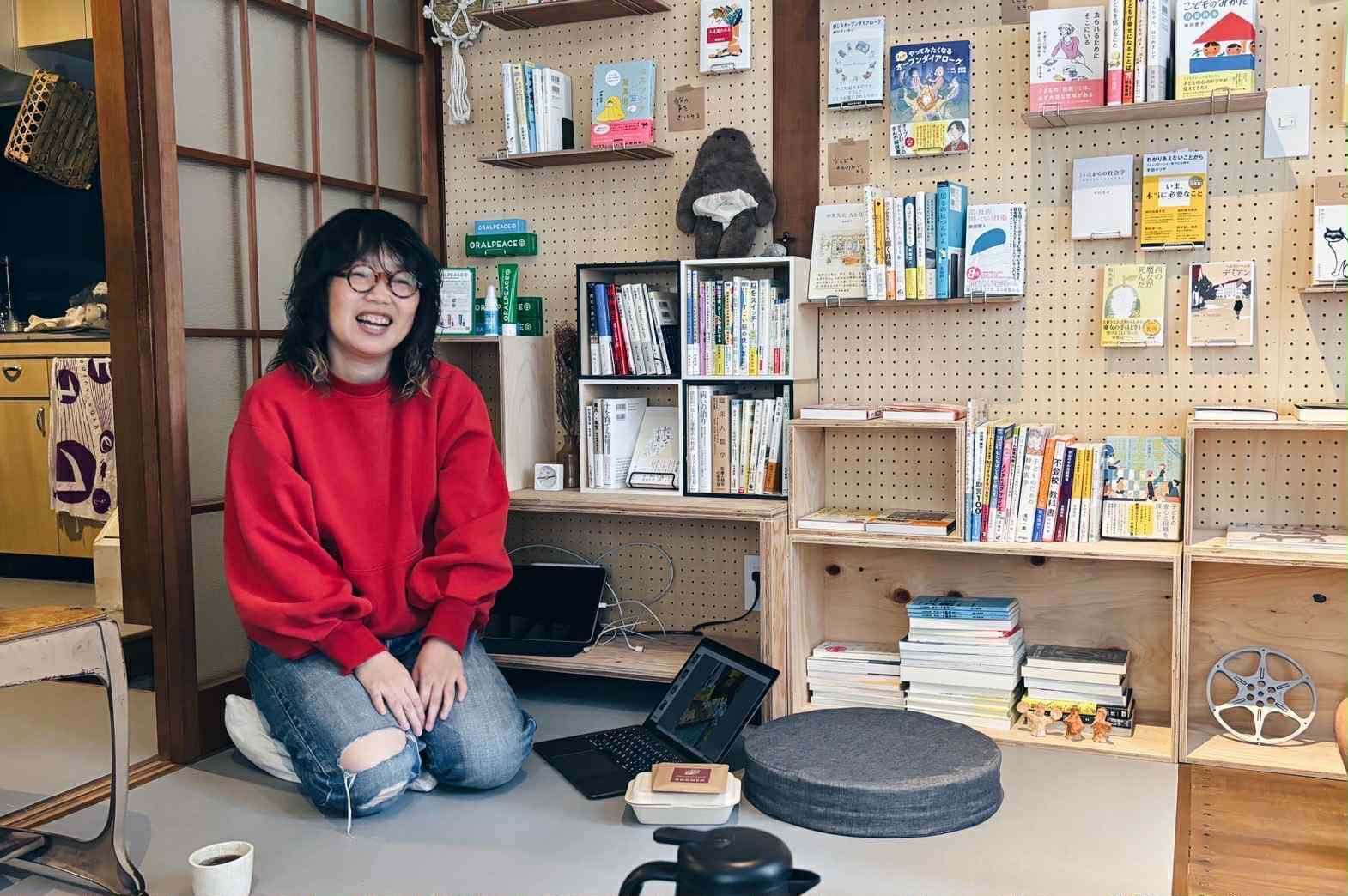 丸山の思いを壁一面の本棚に込めた鳥取市内のスペースで、