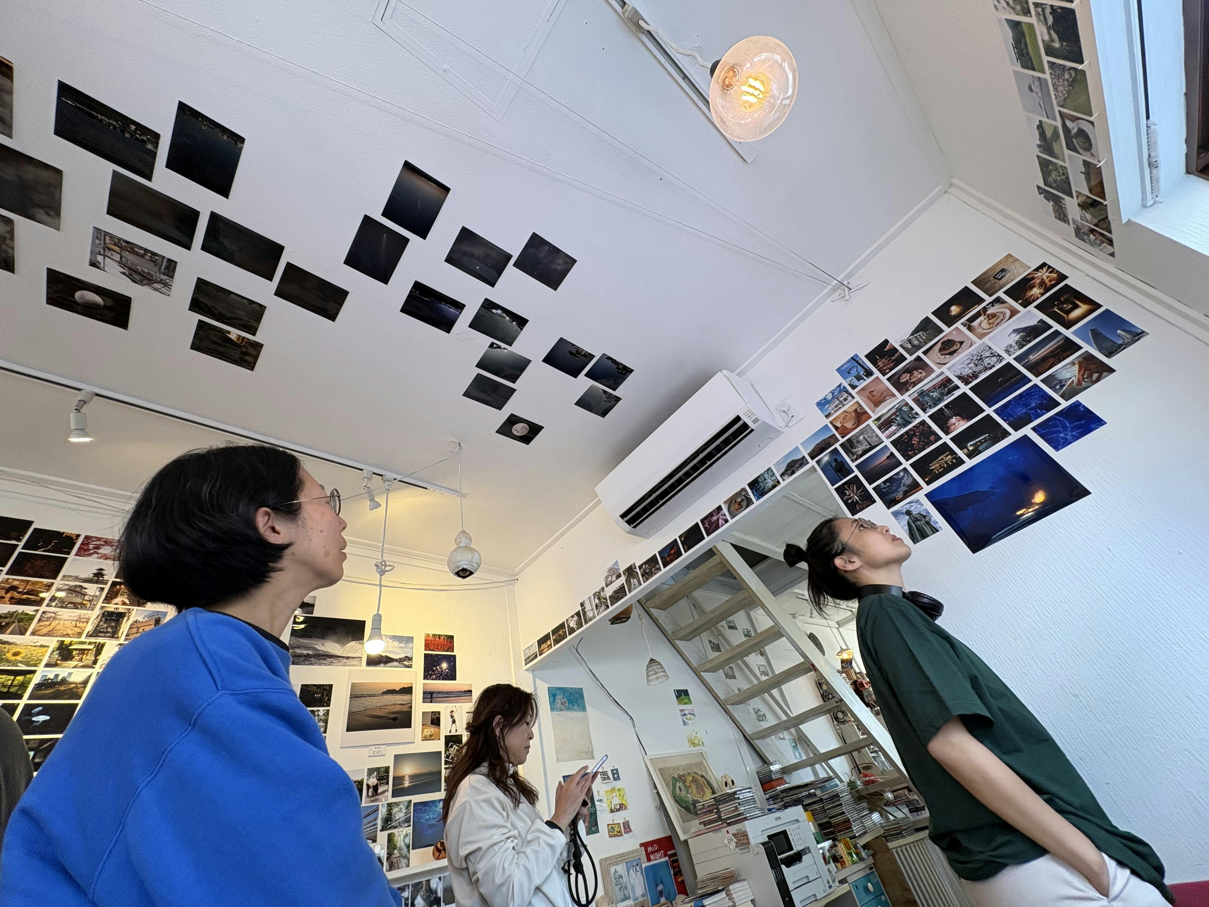 11月中、店内、天井までいっぱいに貼られた 星のソムリエ 梶谷くんの展示も今日まで。これから搬出剥がしを旅の話、星の話を語ってもらいながらやる会に。300枚越えの写真。何時までかかるかなぁ……?