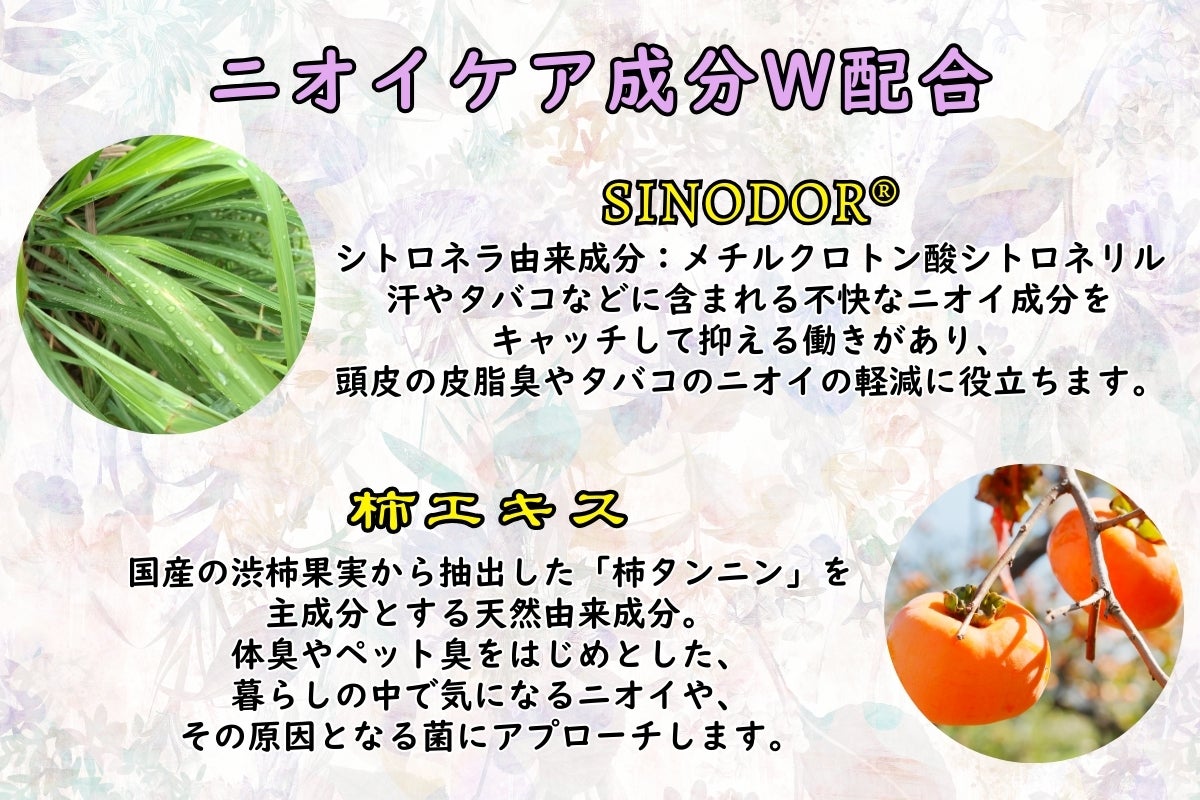 ヨーロッパで採用されている高機能成分で、特に頭皮やタバコなどの気になるニオイに働きかけるとされています。