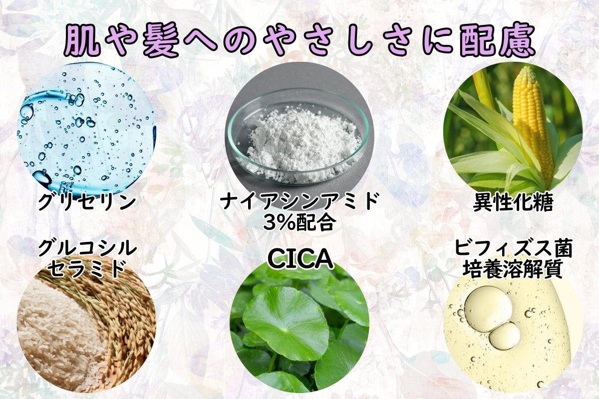 枕や衣類に使うことを想定し、肌や髪に触れる可能性を考慮して以下の成分を配合:
