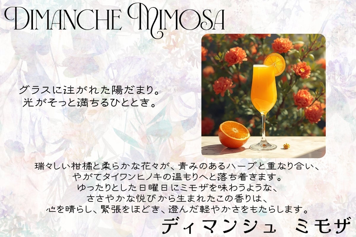 日曜日のブランチに楽しむカクテル〈ミモザ〉のように、明るく爽やかな香り。