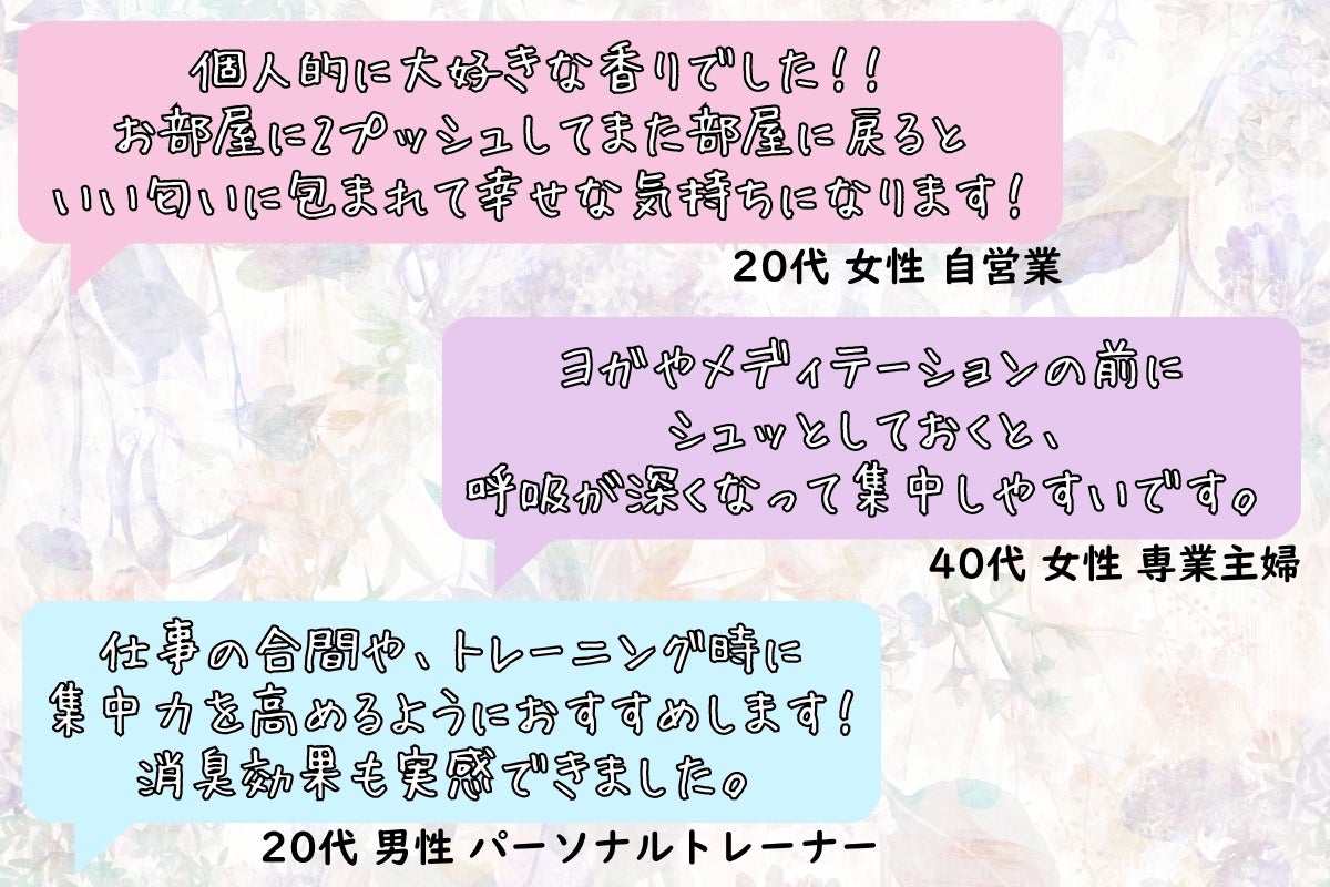 枕やリビングの空間にひと吹きするだけで、癒しのひとときを届けます。仕事や勉強の合間のリフレッシュや、気分を切り替えたいときにもおすすめ。