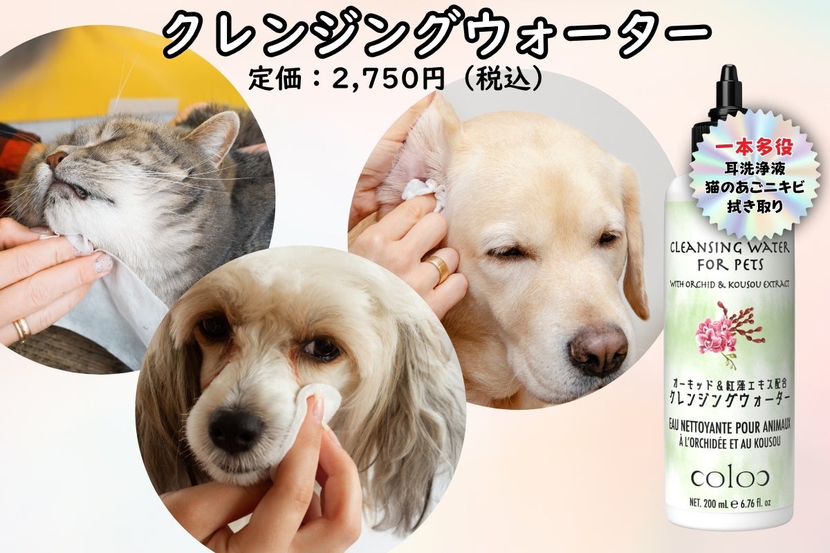 ①汚れの拭き取り(クレンジングウォーター):コットンやガーゼに適量を含ませ、涙やけ、口や顔まわり、猫のあご、お尻まわりなど、汚れが気になる部位をやさしく拭き取ってください。