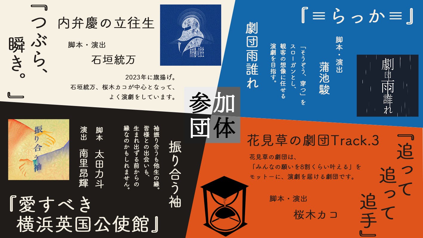 当演劇展は、「横浜での新しいカタチ、新しい場、新しい出会い。若手団体×建築学生で創る演劇ショーケース」と題して立ち上げられました。