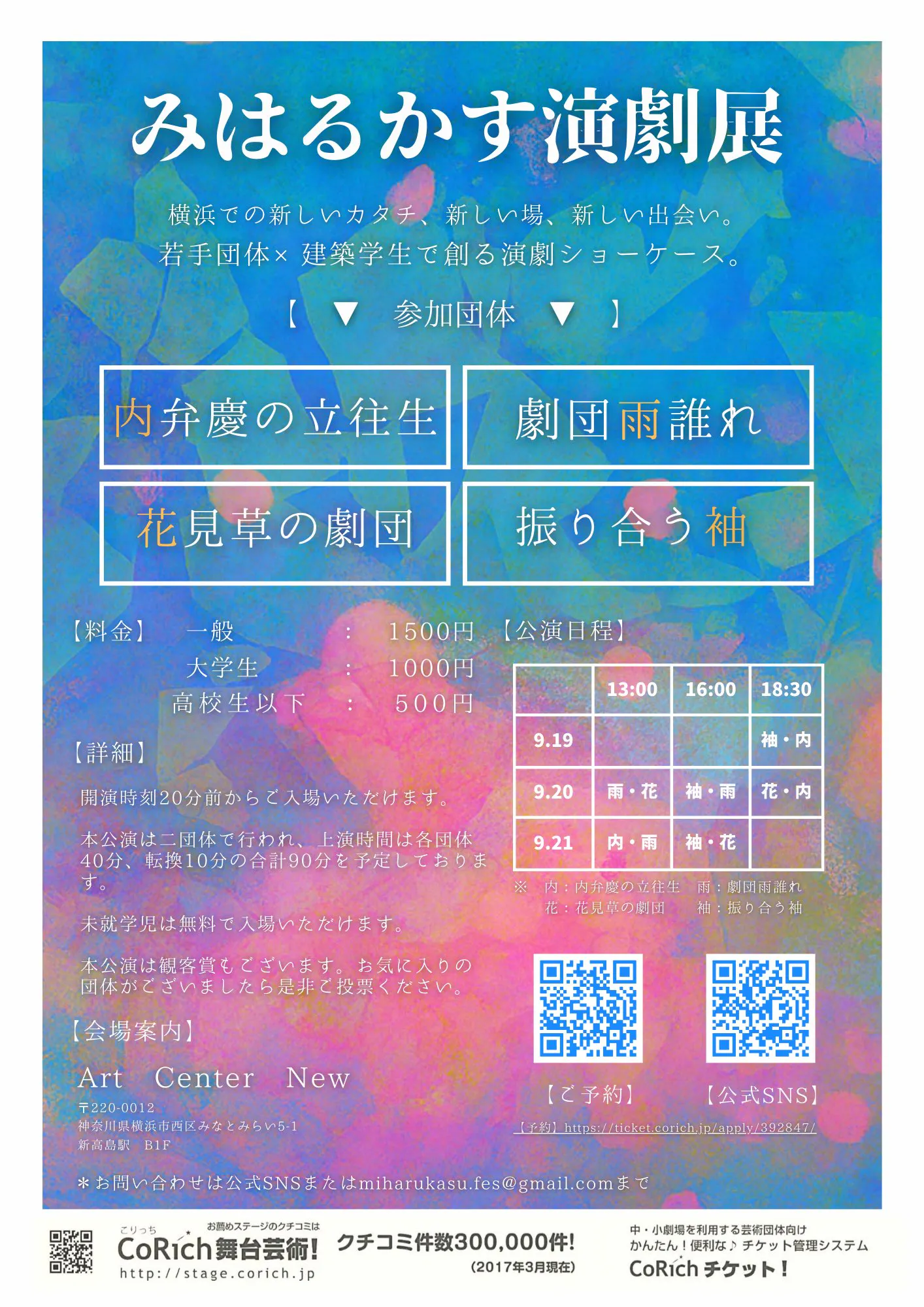 今年の9月19日~21日にみなとみらい線新高島駅直結のArt Center NEWにて開催する、横浜の若手団体が集まる公演『みはるかす演劇展』の運営資金を集めたい