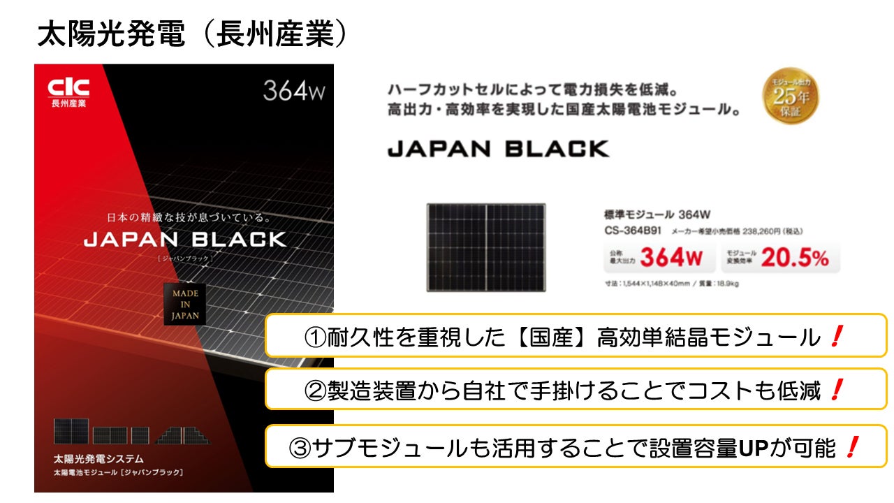 サスティナブルサポート様にご協力頂き、長州産業様の太陽光パネルと蓄電池を設置することになりました。長州産業様は、日本で唯一、太陽光パネルの製造においてすべての工程を日本国内の自社工場で行っている企業で、太陽光パネルのシェア1位を2022年から維持しています。